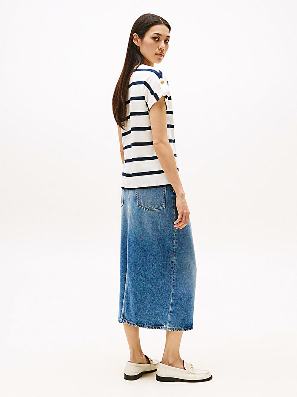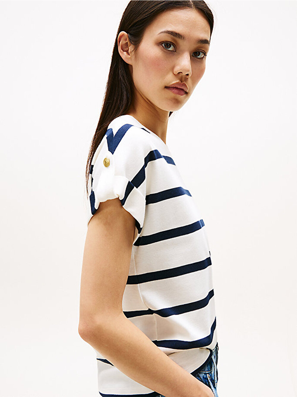 Altın düğmeli kıvrılabilir manşetleri ve etek ucundaki metal Tommy Hilfiger bayrağı, bu pamuklu tişörte imza bir stil kazandırıyor.