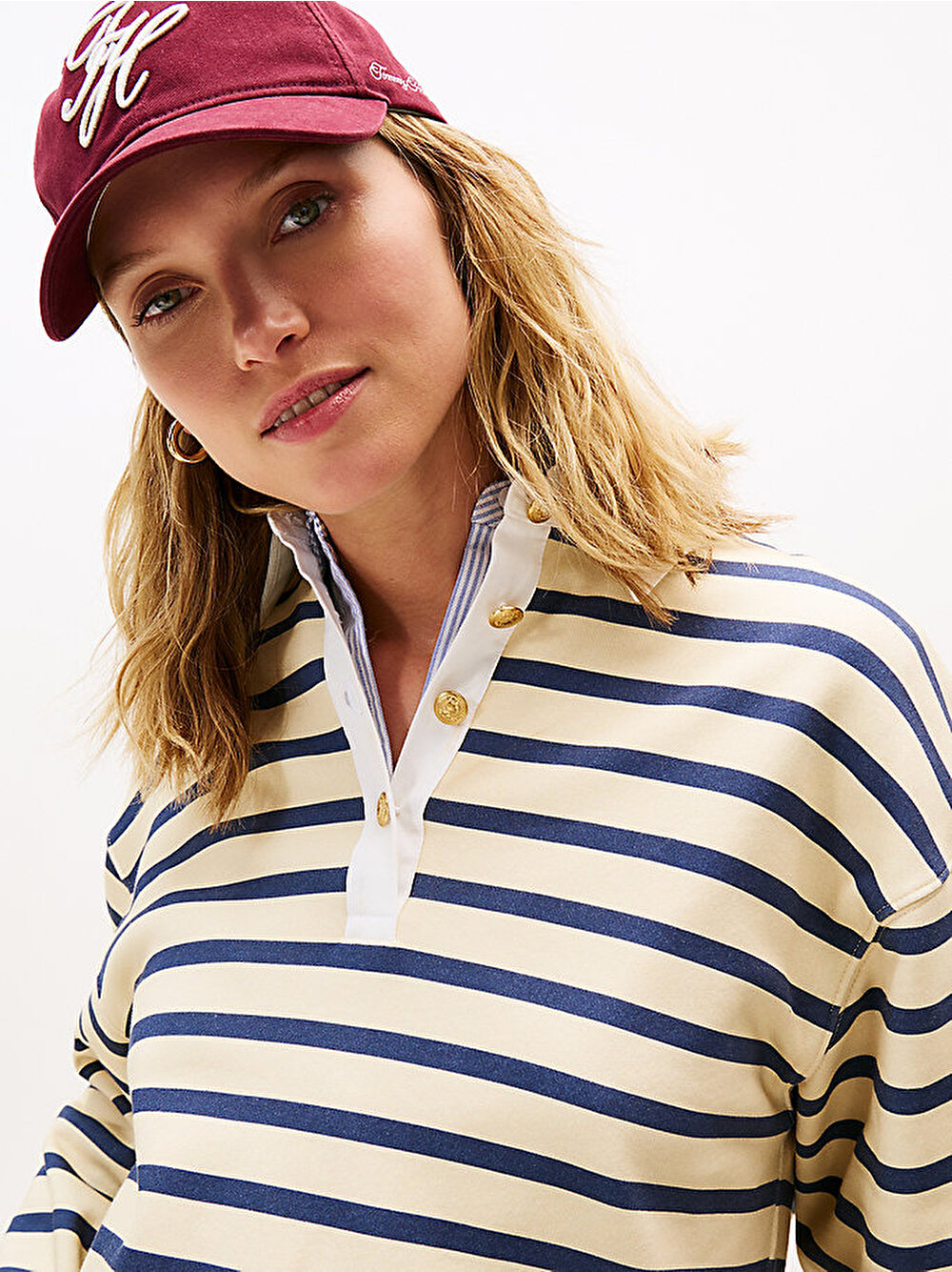 Ragbi stilinden ilham alan bu rahat sweatshirt, pat üzerindeki markalı altın tonlu düğmeleriyle üst düzey bir görünüm sunuyor.