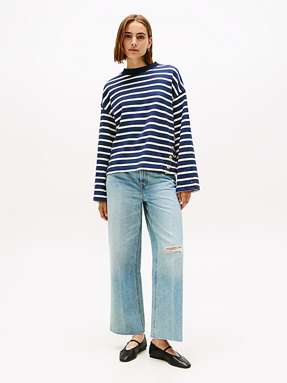 Kontrast yarım boğazlı yakası ve yan kısımdaki altın tonlu düğmeleriyle klasik tasarıma yükseltilmiş bir yorum getiren bu çizgili sweatshirt, modern şıklık sunuyor.