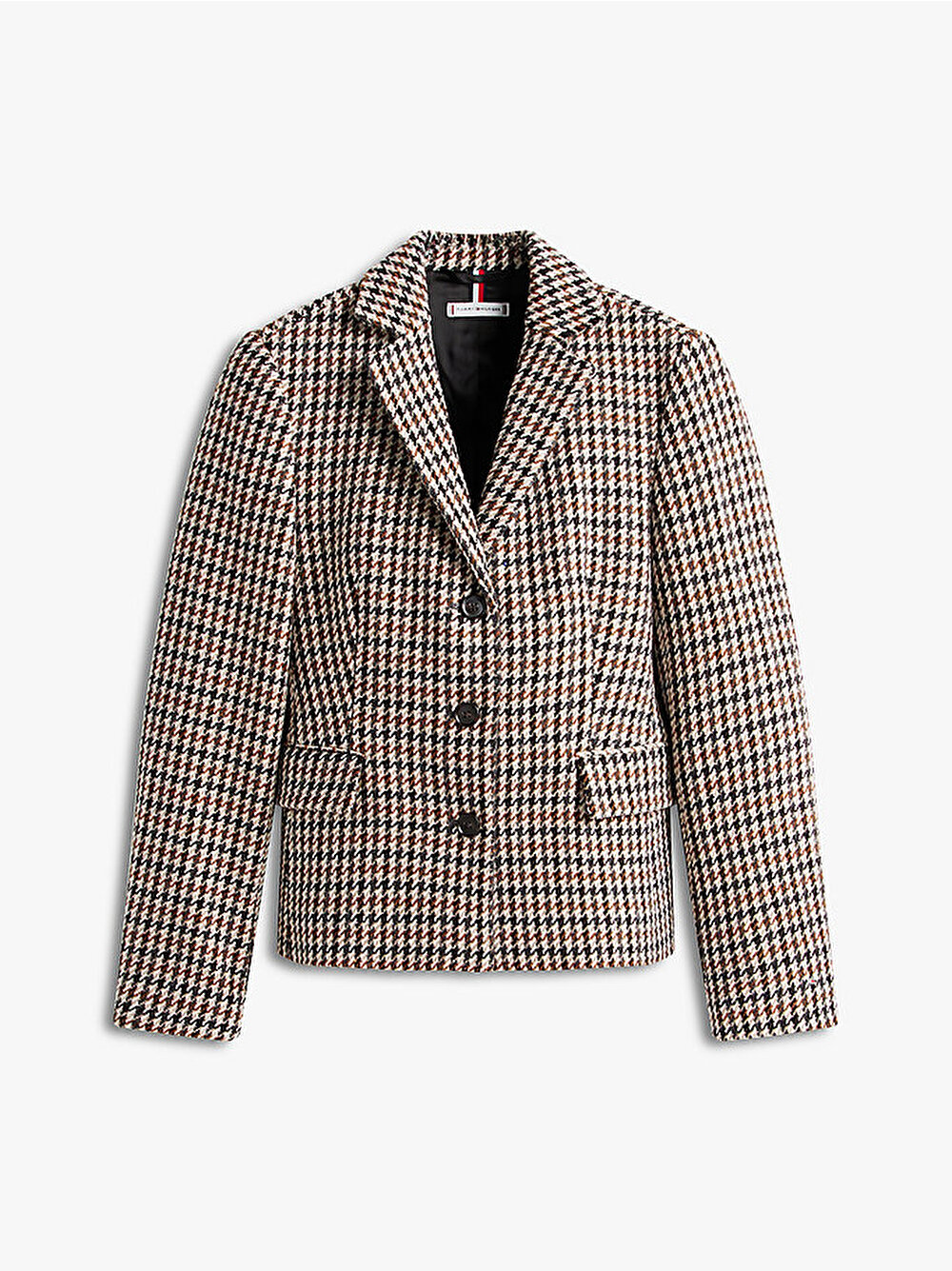 Tek düğmeli bu blazer, akıllıca yapılandırılmış formu ve baştan sona retro ilhamlı ekose deseniyle sofistike bir görünüm sunuyor.