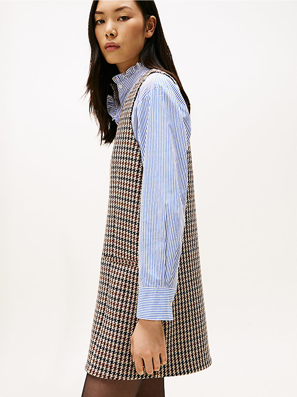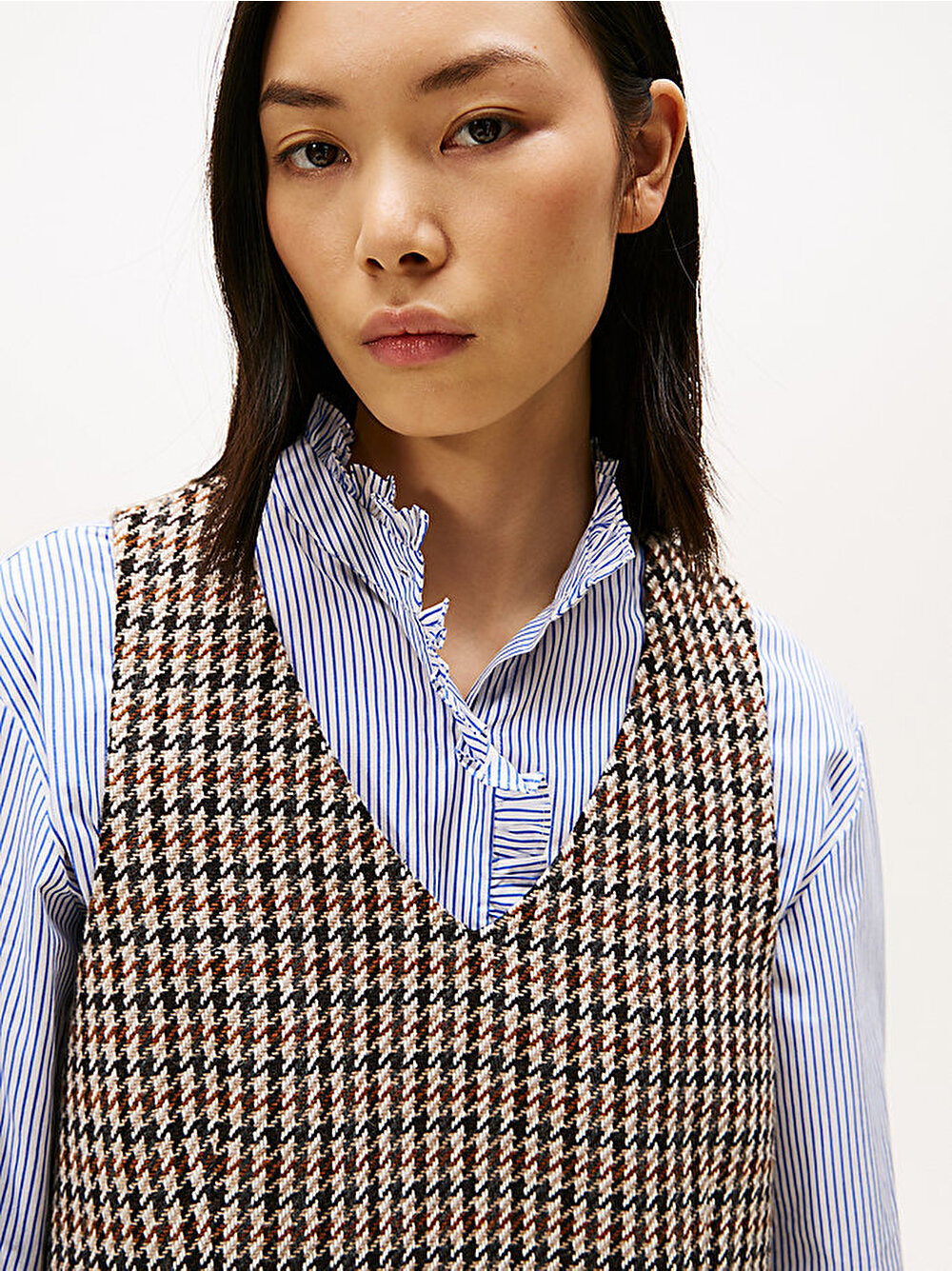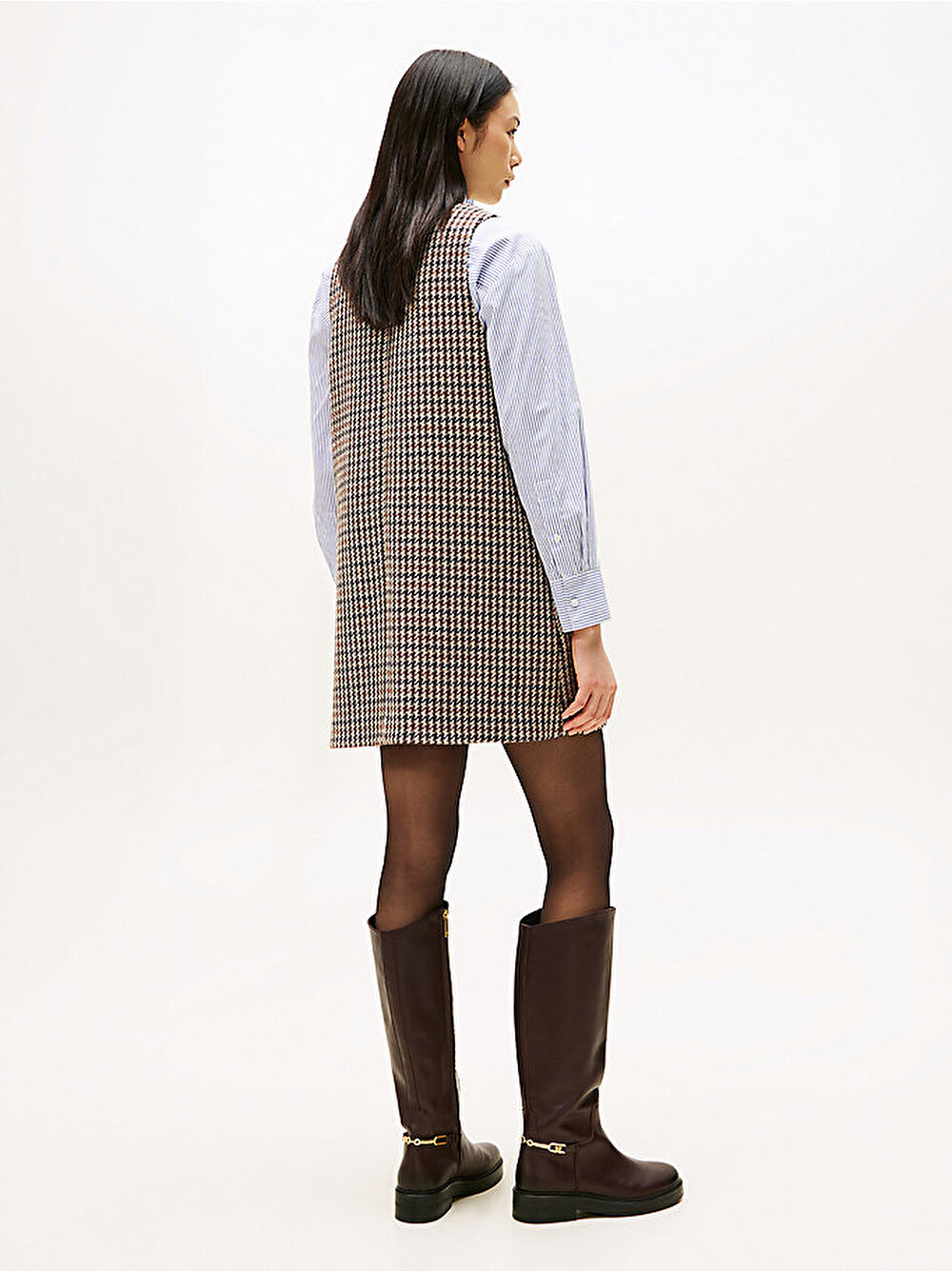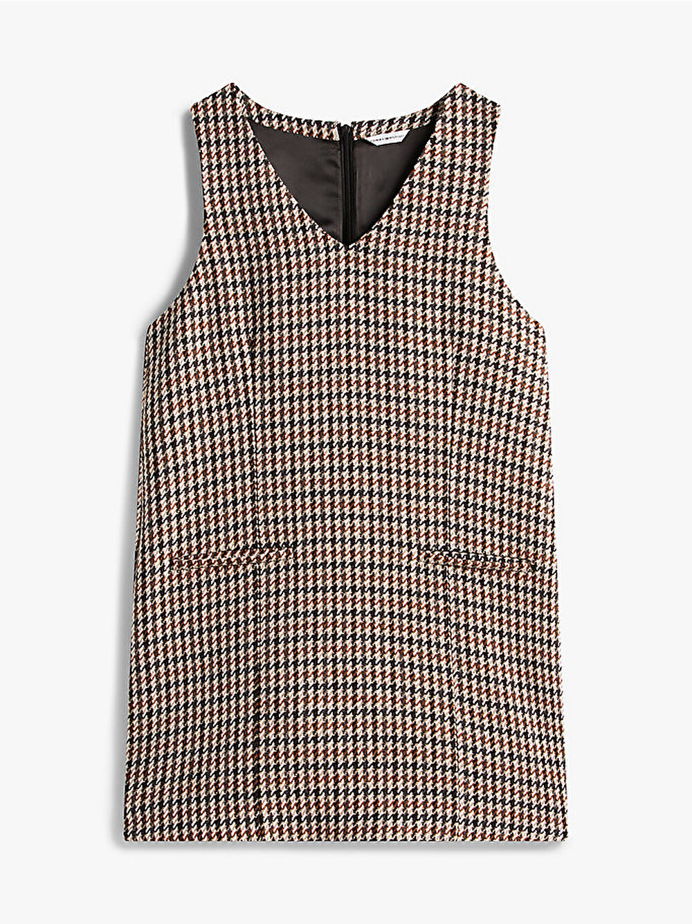 Birinci sınıf saf yünden baştan aşağı miras ekose tasarıma sahip bu kolsuz V yaka mini shift elbiseyle klasik katmanlamayı kucaklayın.