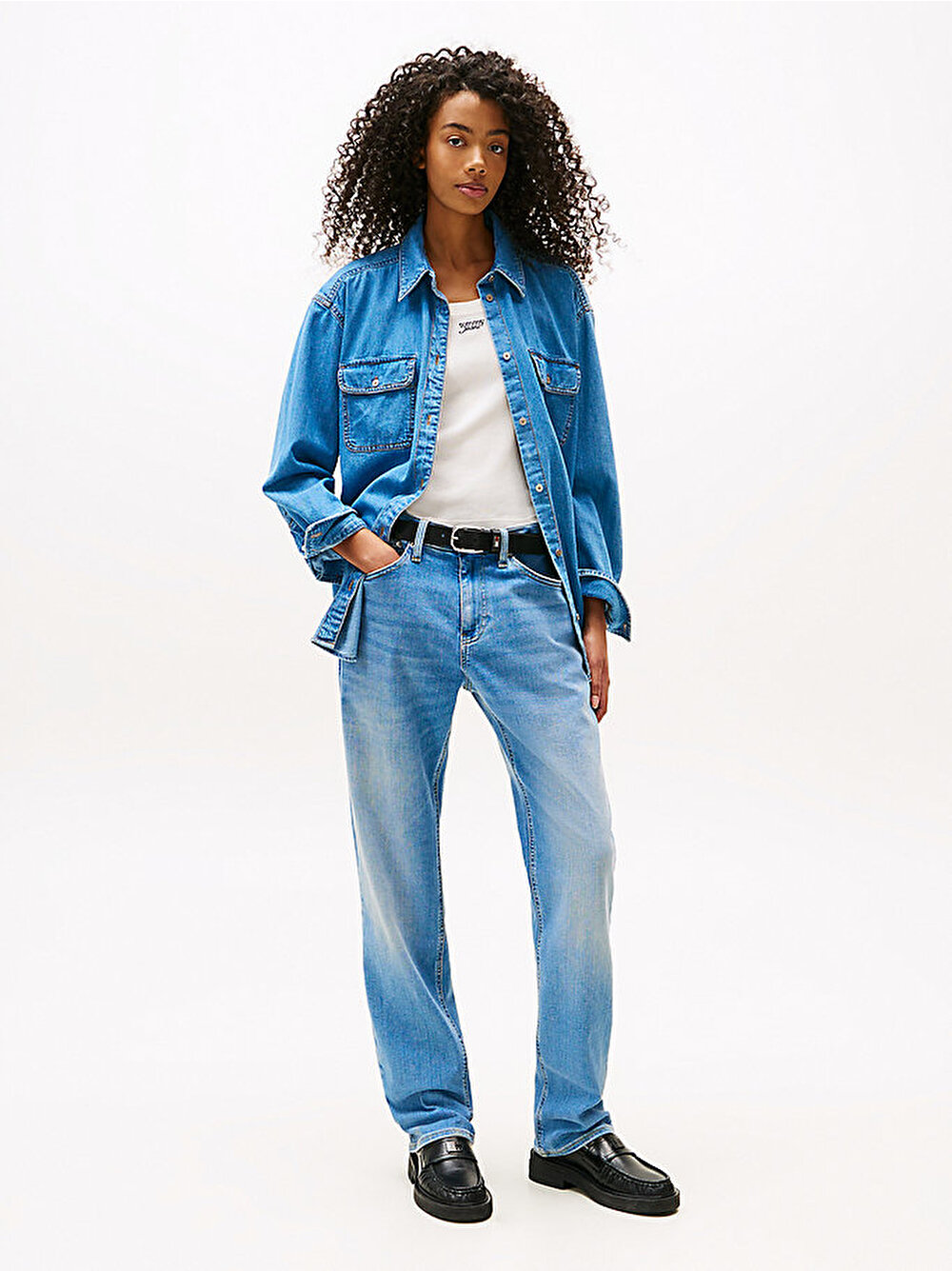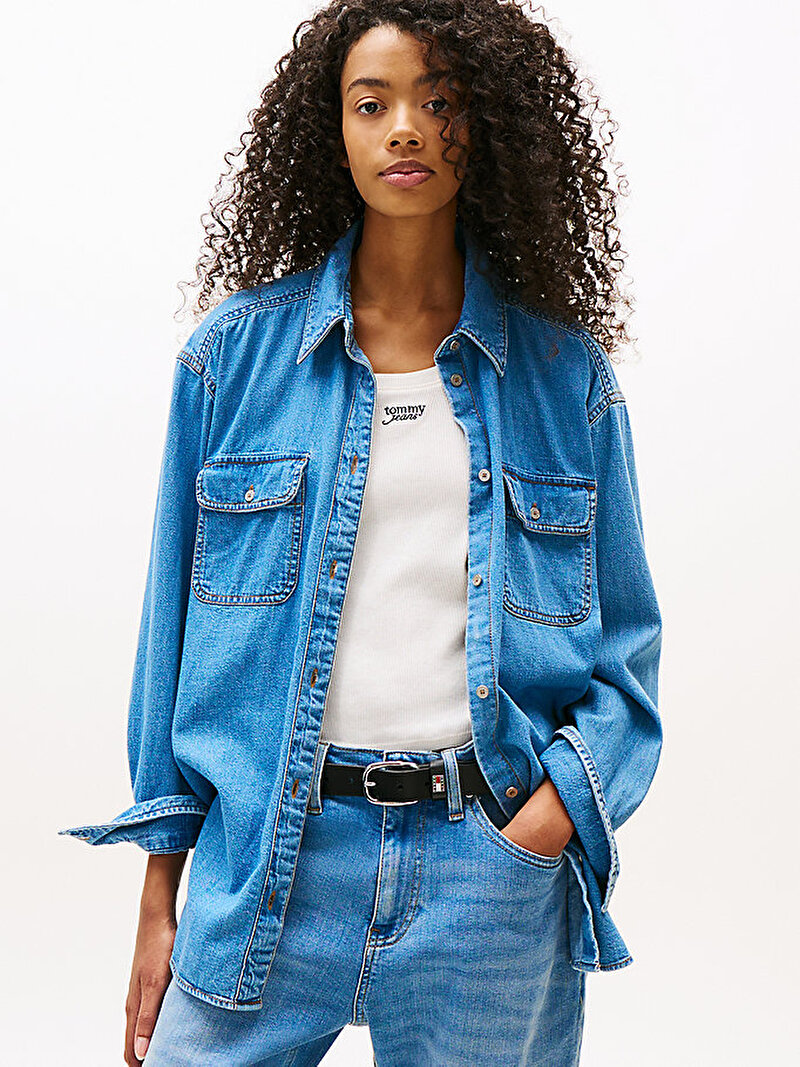 Zarif bayrak detayıyla tamamlanan bu rahat kesimli denim gömlek, hem katmanlı kombinlerde hem de tek başına stil sahibi bir görünüm sunuyor.