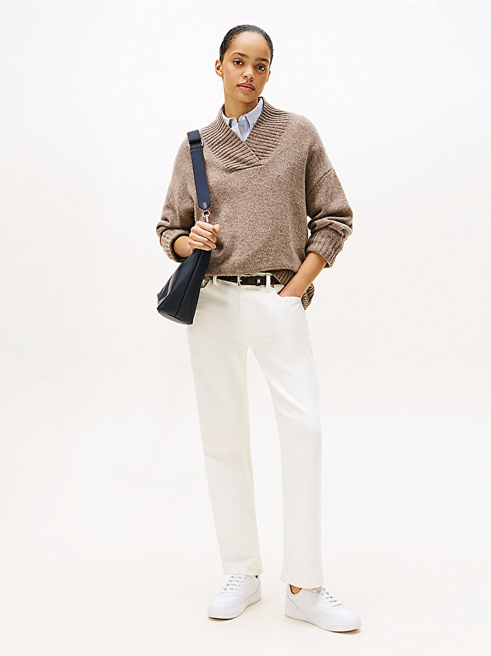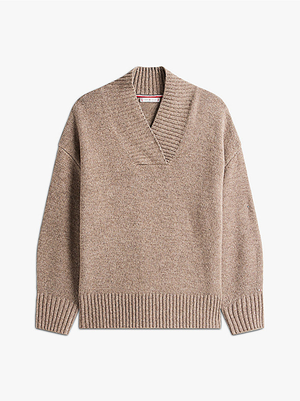 Melanj örgü ve şal yaka detayı bu kazağa rahat bir hava katarken, saf yün yapısı da üstün bir kalite hissi sunar.