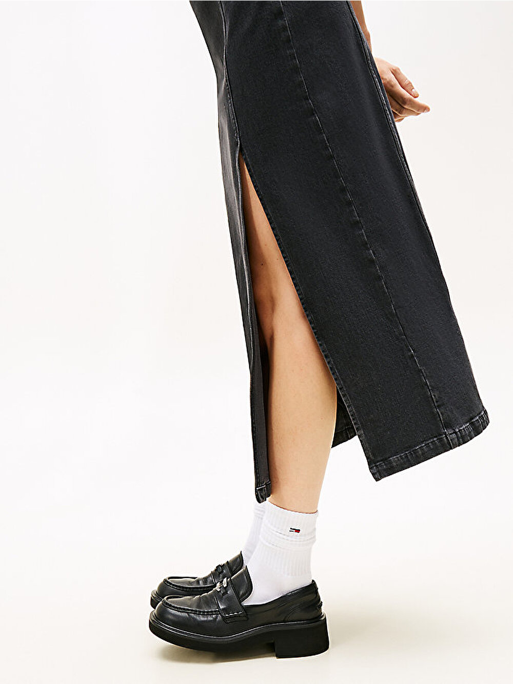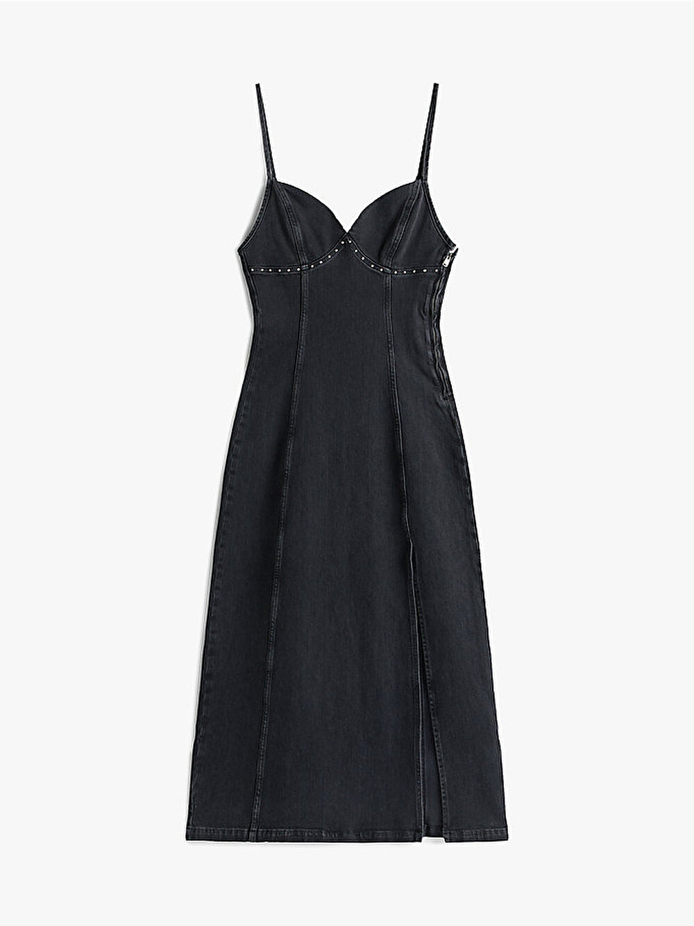 Bu slim fit denim elbise, hareket özgürlüğü sunan yırtmaç ve zıt metal perçin detaylarıyla tamamlanmıştır.
