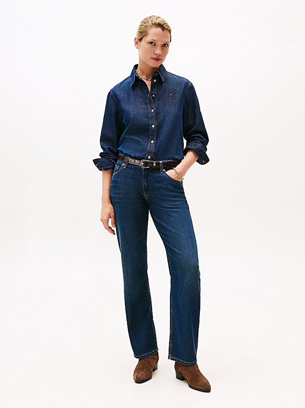 Streç pamuklu denimden hafif soluk görünümlü bu jean pantolon, straight leg kesimi ve yüksek beliyle sınırsızca vücuda oturan bir form sunuyor.