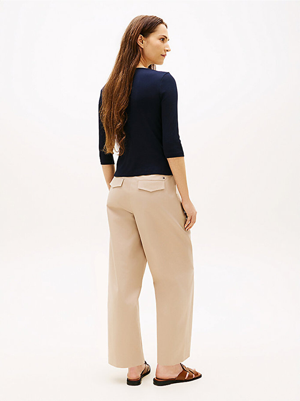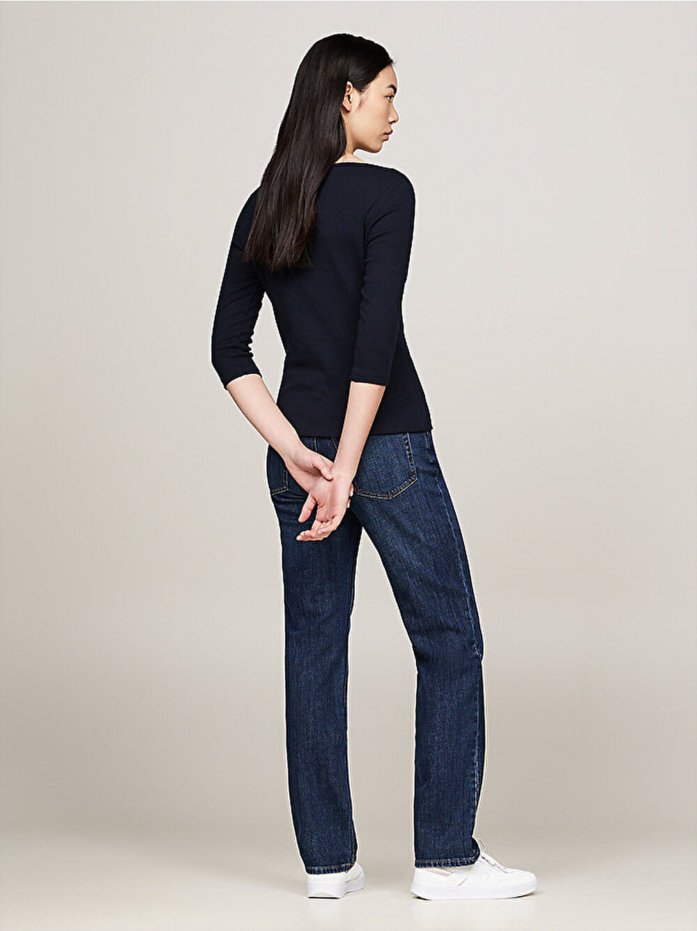 Kayık yaka, ipeksi yüzey ve üç çeyrek kol tasarımı, bu slim fit ribana örgülü tişörtü zarif ve vücuda yakışan temel bir parça haline getirir.