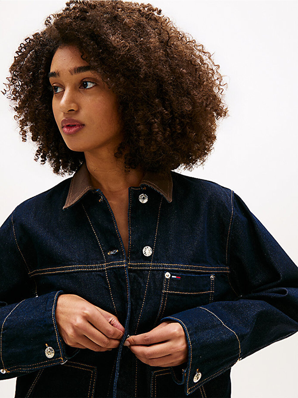 Bu denim günlük iş ceketi, otantik iş kıyafeti stilini oversize kesimle birleştirerek yapılandırılmış tasarıma modern bir enerji katıyor.