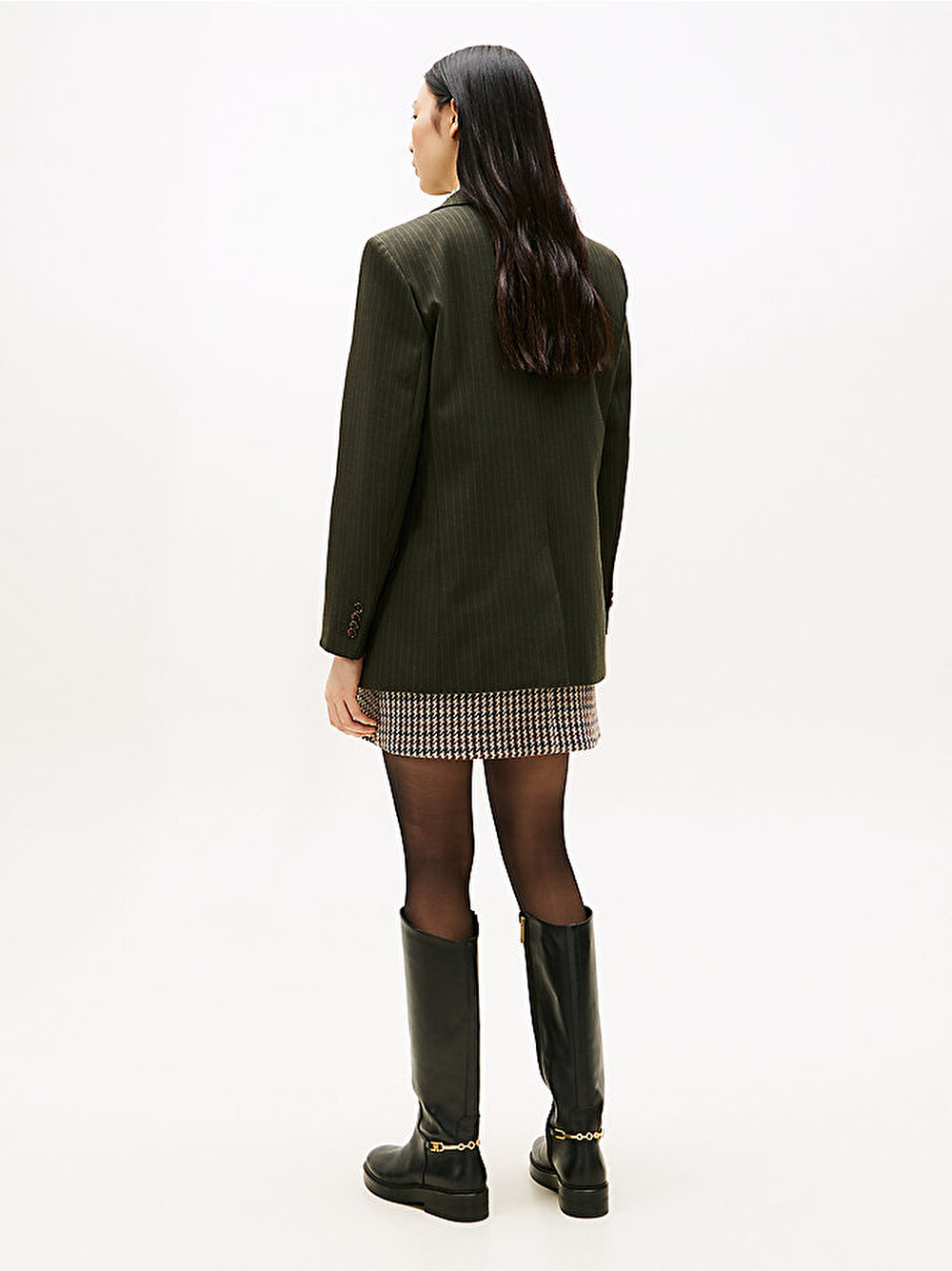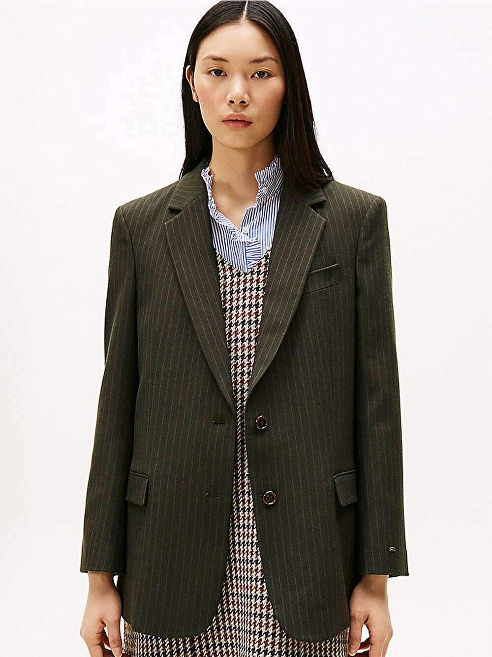 Bu ince çizgili blazer ceket, oversized kesimiyle smart kombinlerinize rahat bir hava katar ve salaş bir görünüm sunar.