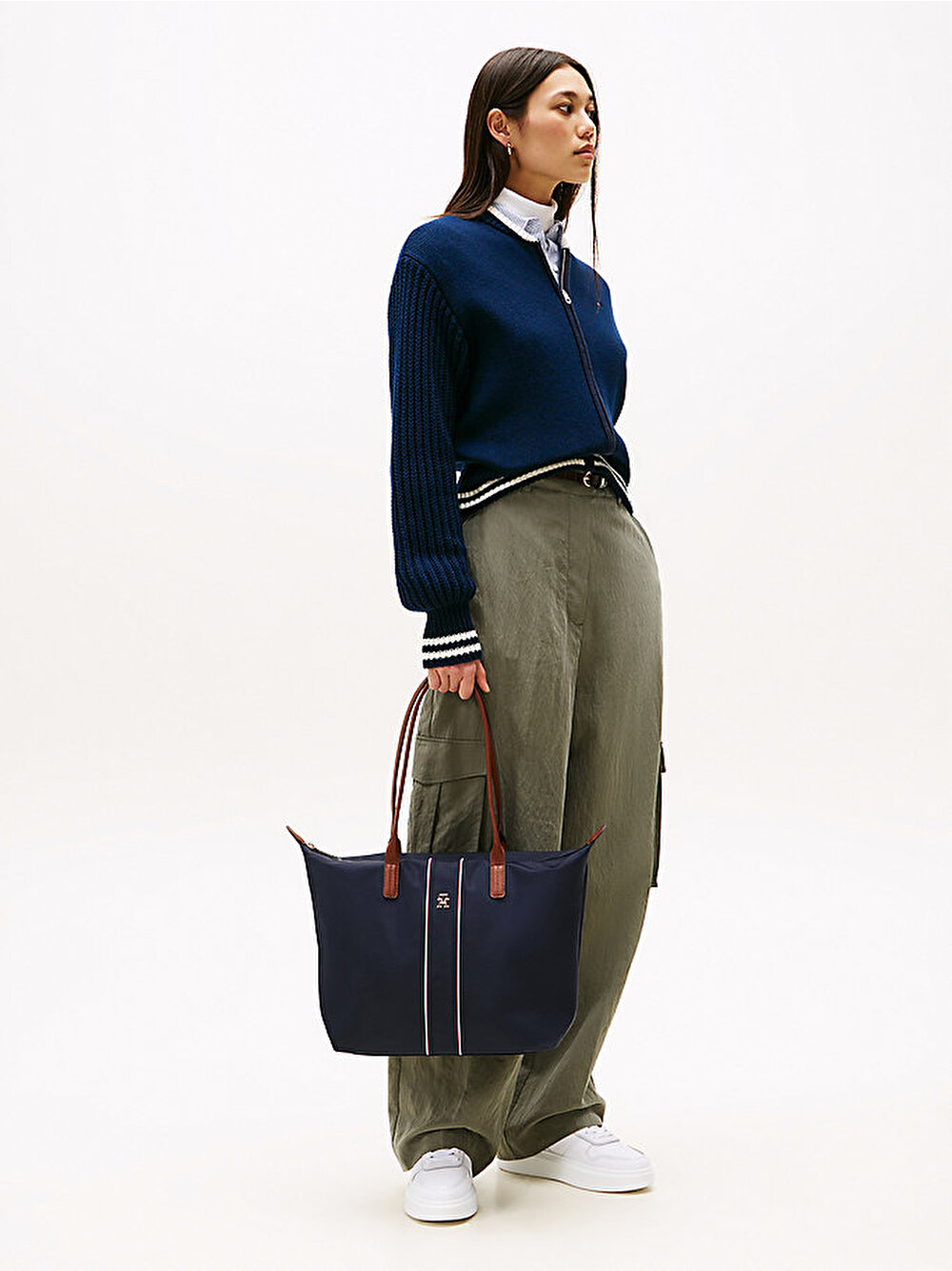 Bu tote çanta, çağdaş bir zerafet hissi sunan imza renk dokunuşlu naylon dokusuyla dikkat çekiyor.