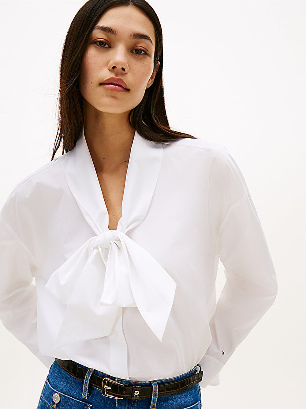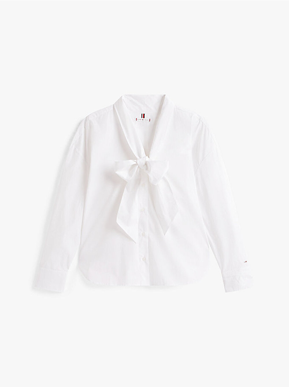 Klasik bir stile taze ve feminen bir yorum getiren bu saf pamuklu poplin gömlek, oversize kesimi ve eğlenceli papyon yakasıyla dikkat çekiyor.