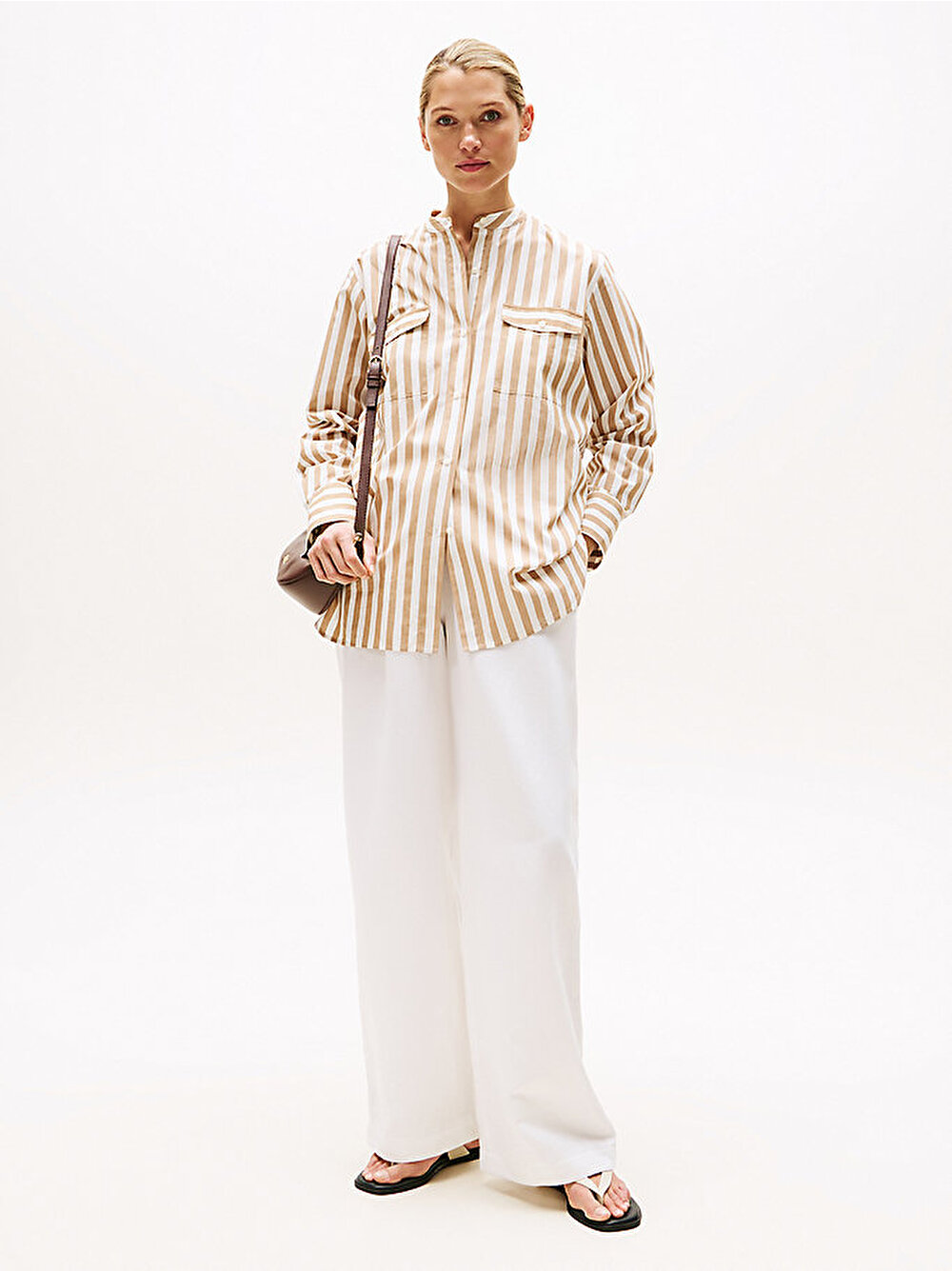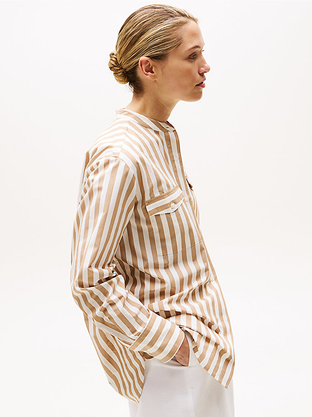 Yakası olmayan tasarımıyla modern bir hava kazanan bu poplin gömlek, ayarlanabilir manşetleriyle farklı stiller yaratmananıza olanak tanır.