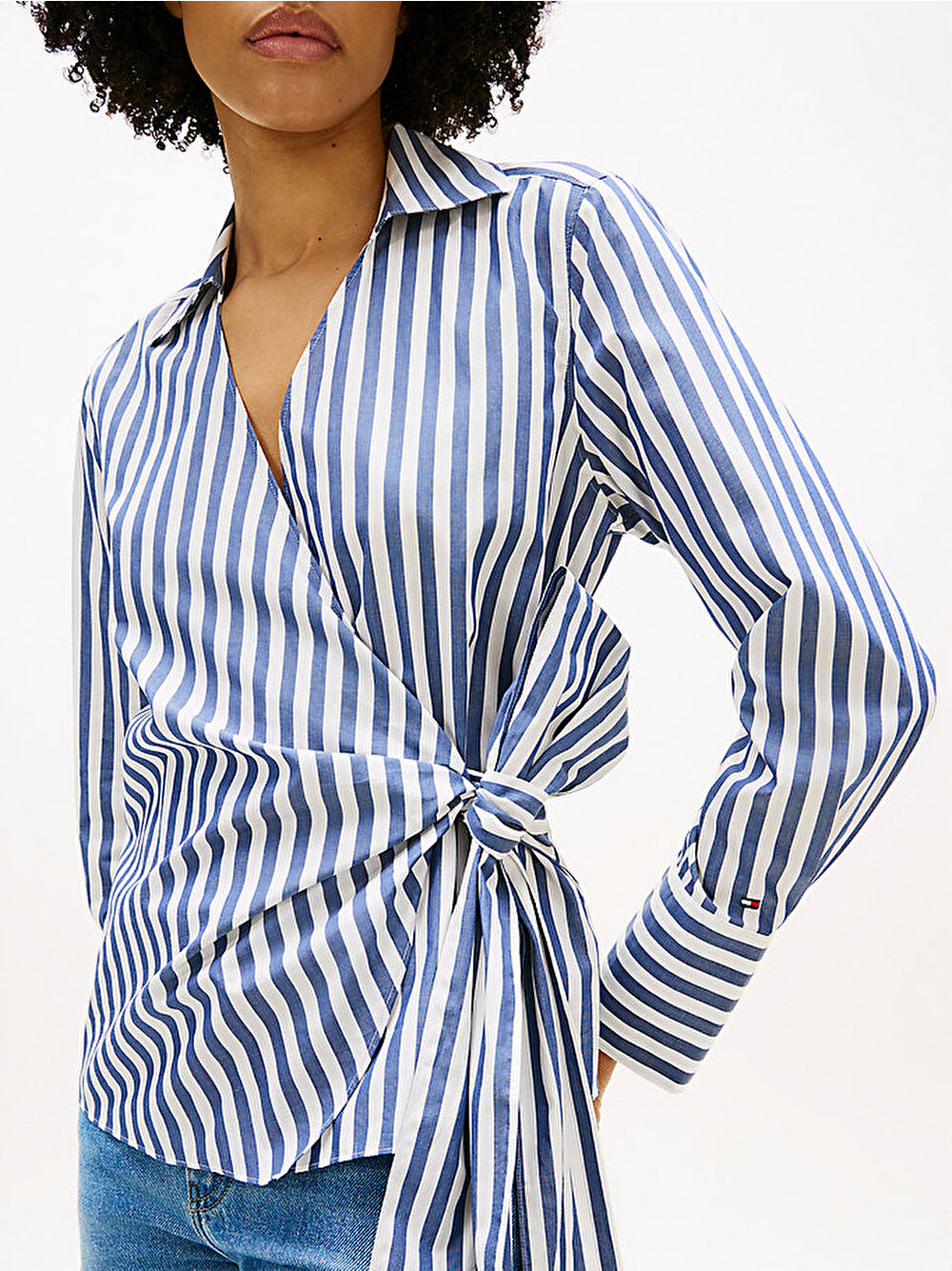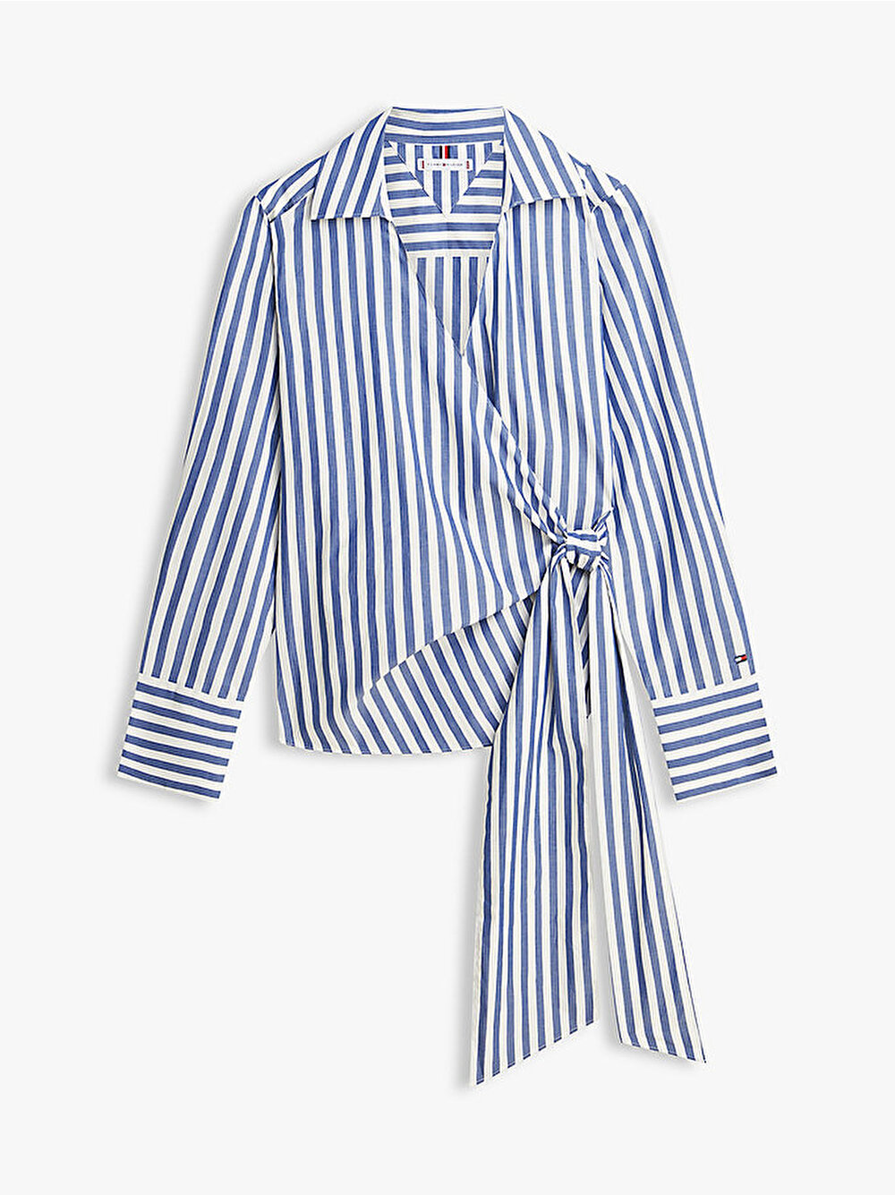 - Uzun yan bağcıklar bu kruvaze gömleğe şık bir dokunuş katarken, klasik yaka ve geniş manşetler geleneksel gömlek tasarımına gönderme yapıyor.
