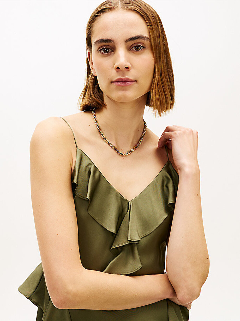 Fırfırlı detayları ve ipeksi saten dokusuyla bu maxi slip elbise, akşam planlarınıza ihtişamlı bir dokunuş getirecek.