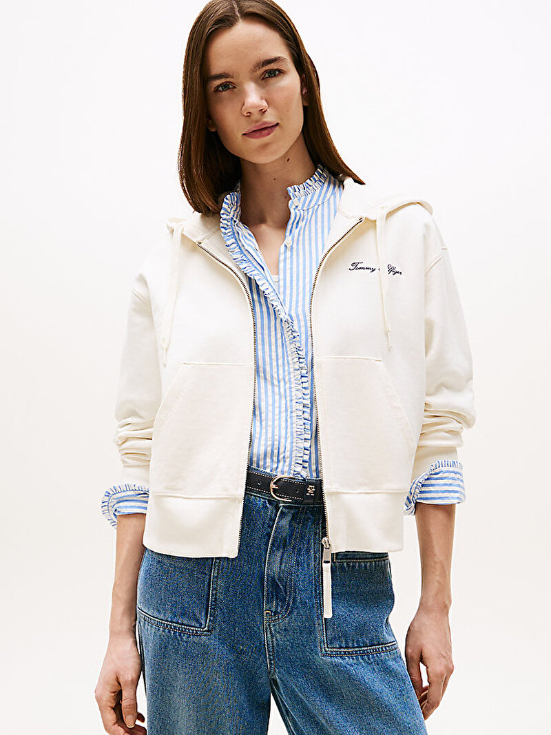 Bu fermuarlı kapüşonlu sweatshirt'ün göğsünde kontrast bir yazı logosu bulunur ve her katmanda imza stilinizi korur.