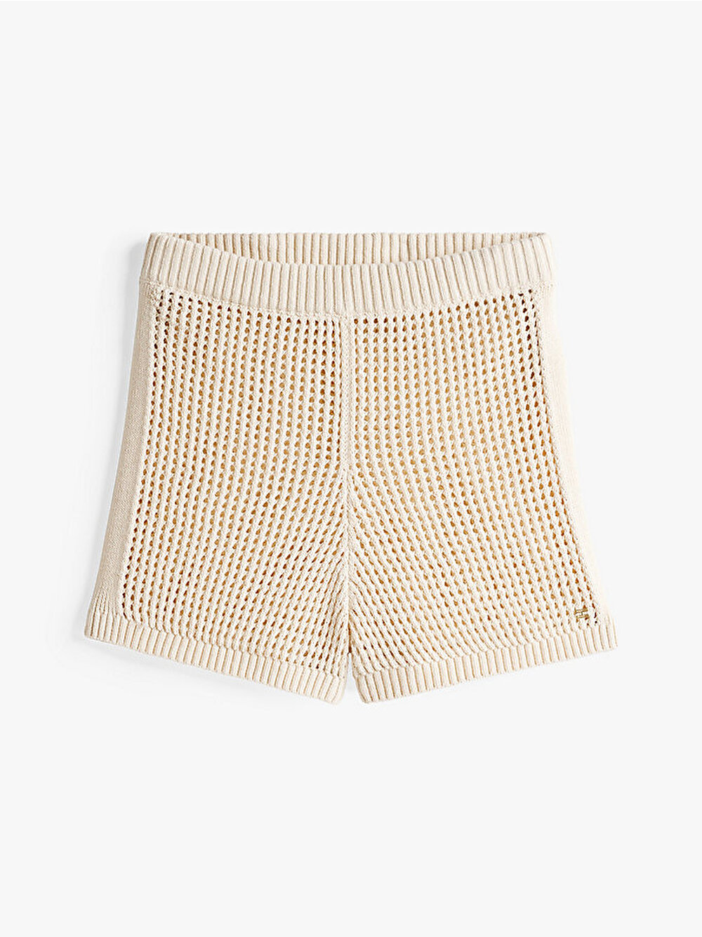Açık örgü kroşe tasarımıyla bohem bir hava sunan bu plaj şortu, esnek beli sayesinde mayo üzerine kolayca giyilebilir.