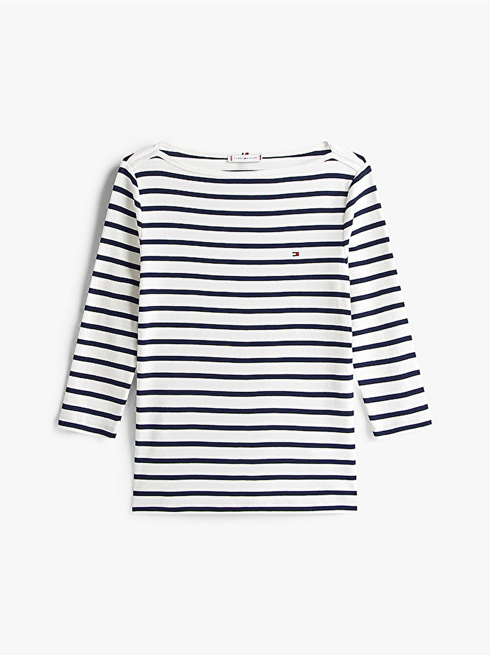 Bu üç çeyrek kollu, kayık yakalı slim fit tişört, ipeksi yüzeyli ribanalı pamuktan üretilmiş zamansız bir parçadır.