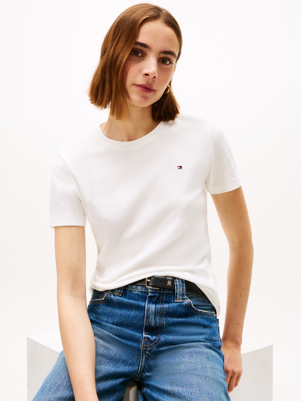 Bu saf pamuklu tişört, bisiklet yakası ve vücuda oturan slim fit kesimiyle konforu ve çok yönlü stili bir araya getiriyor.