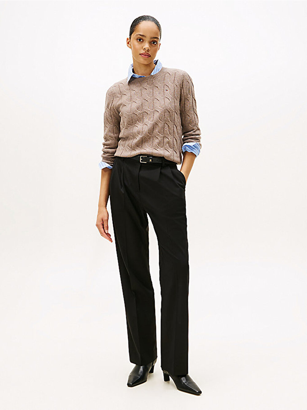 Saf yünden üretilen bu yumuşak dokunuşlu kazağın zamansız kablo örgü tasarımını seçerek miras stillere modern bir yorum getirin.