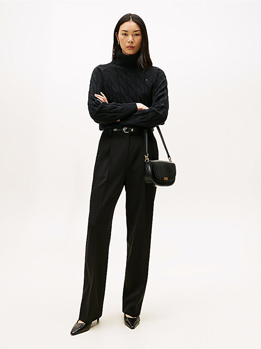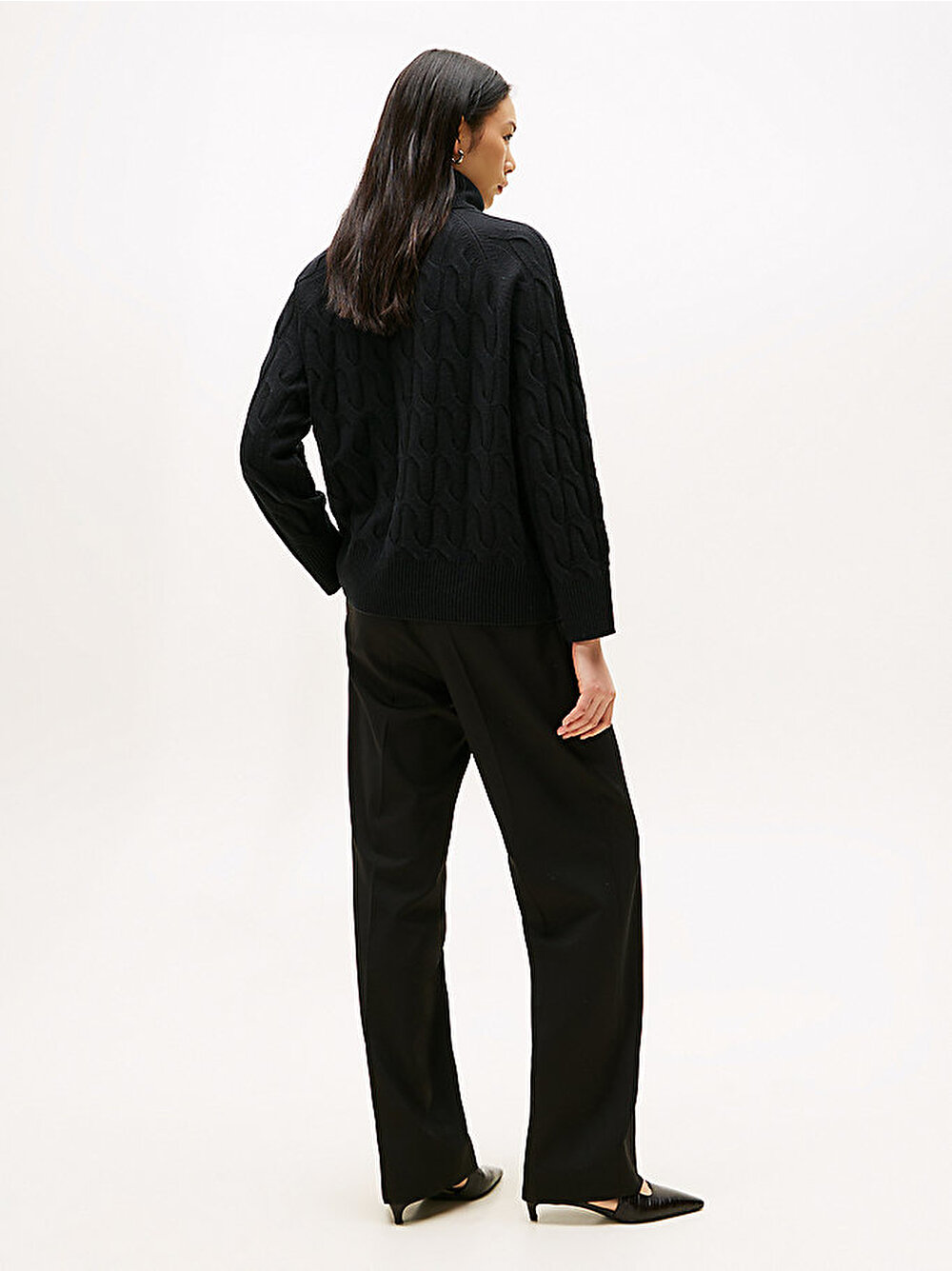 Oversize kablo örgüsü, yumuşak ve sıcacık saf yünden üretilen bu rahat rulo yaka kazağa modern bir dokunuş katıyor.