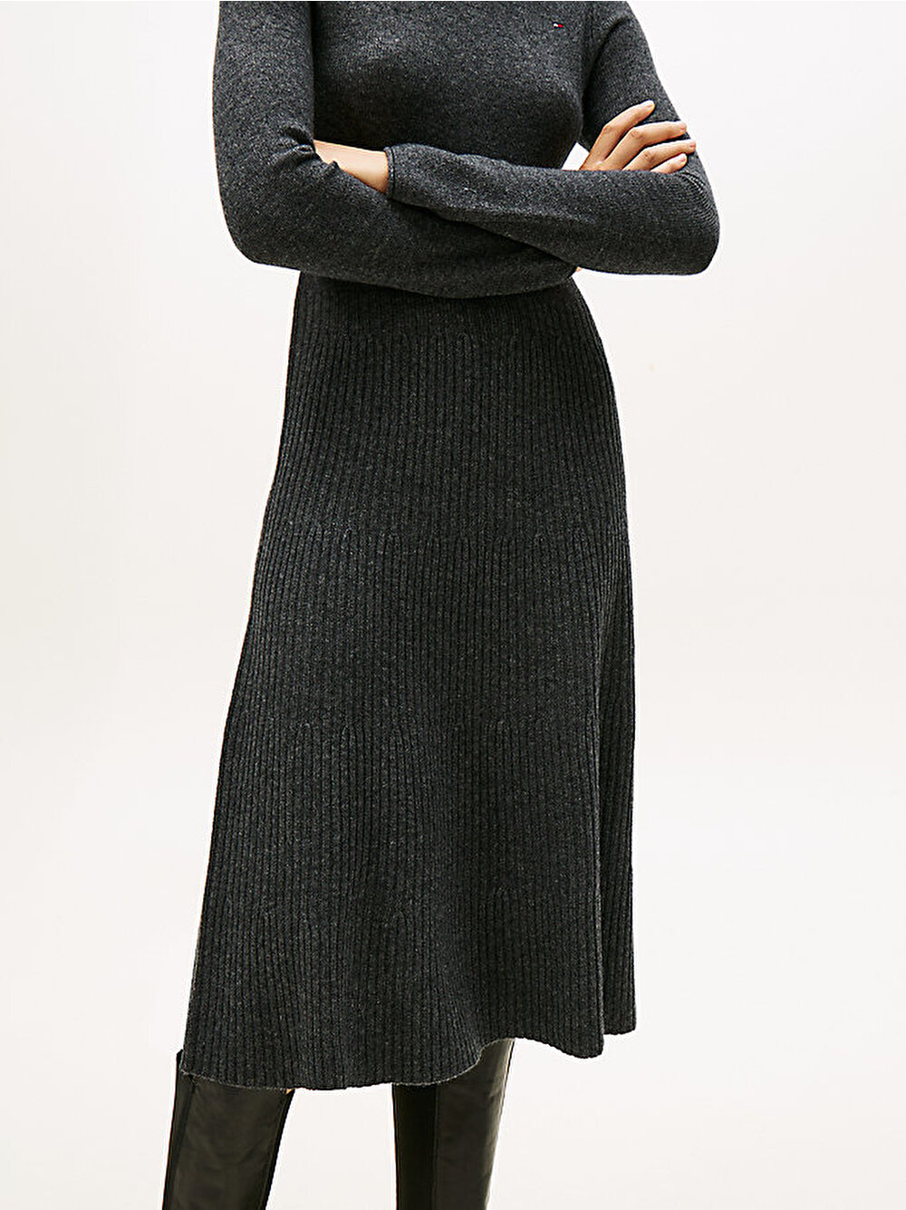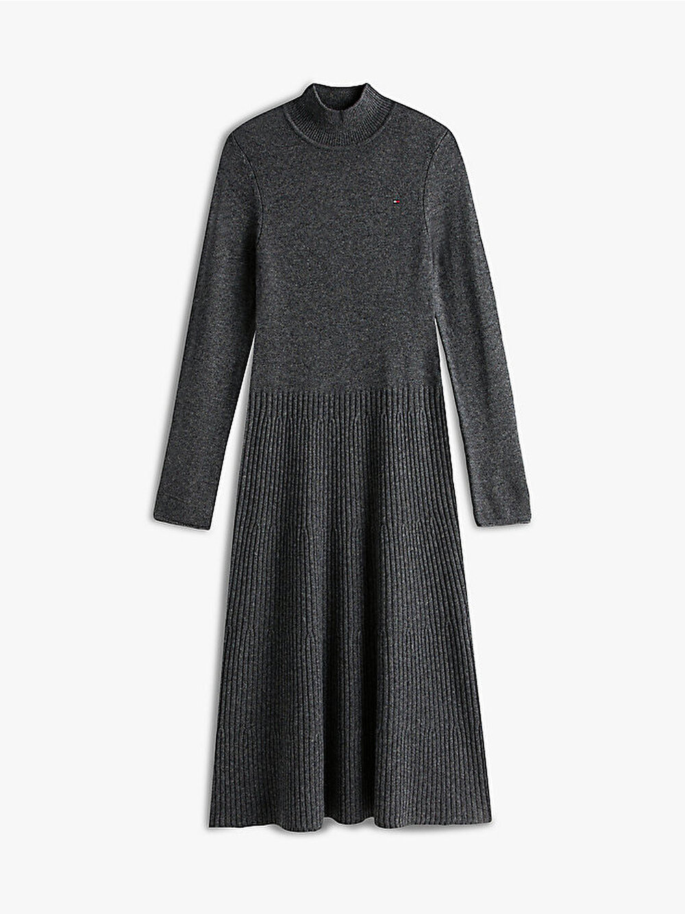 Bu yumuşak, saf yün kazak elbise, şık yarım boğazlı yakası ve hafif kloş midi boy eteğiyle zarif bir siluet sunar.