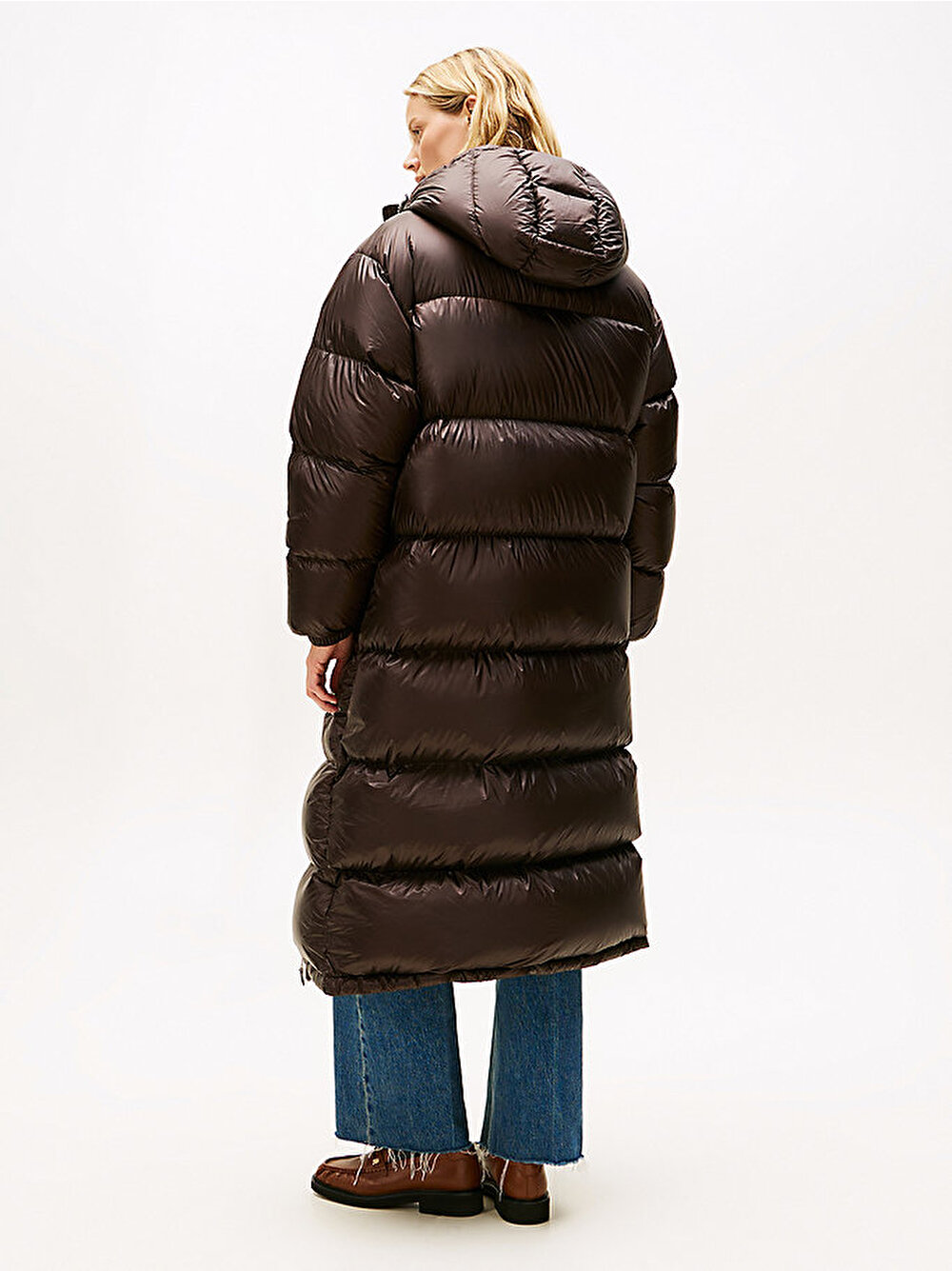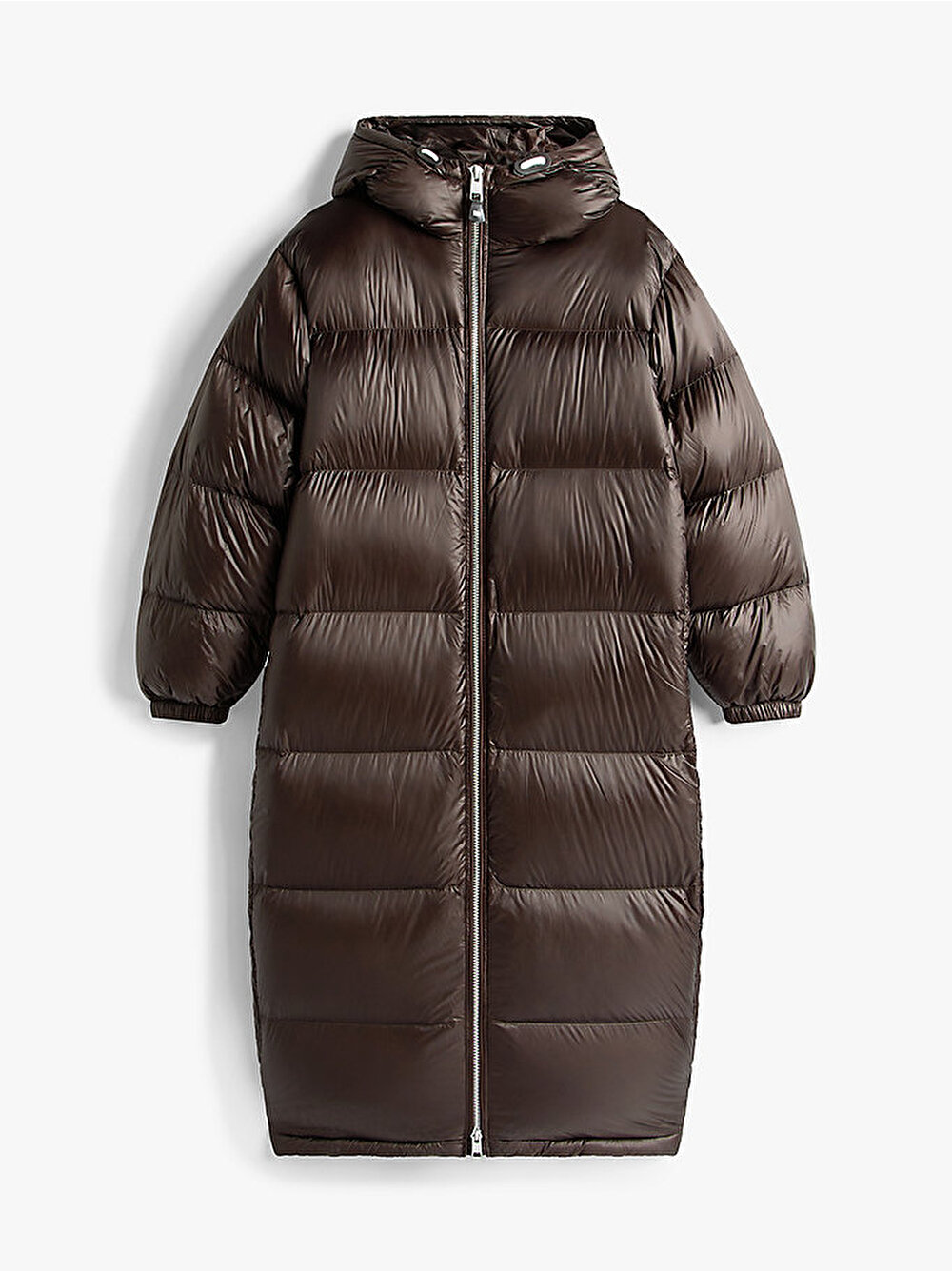 Peluş kuş tüyü dolgulu şişme mont tasarımı ve pratik su itici kaplamaya sahip bu ultra hafif uzun palto ile şık ve sıcacık sarının.