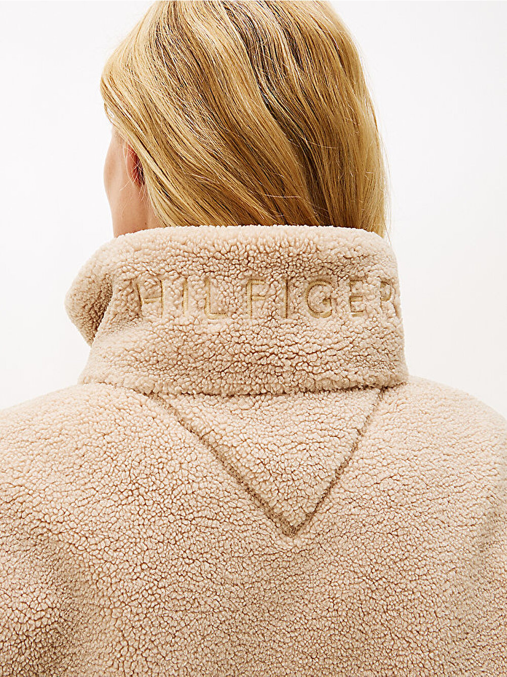 Yüksek yakalı ve ekstra yumuşak şerpa polar dokuya sahip bu rahat ceket ile soğuk günlerde sıcacık sarının.