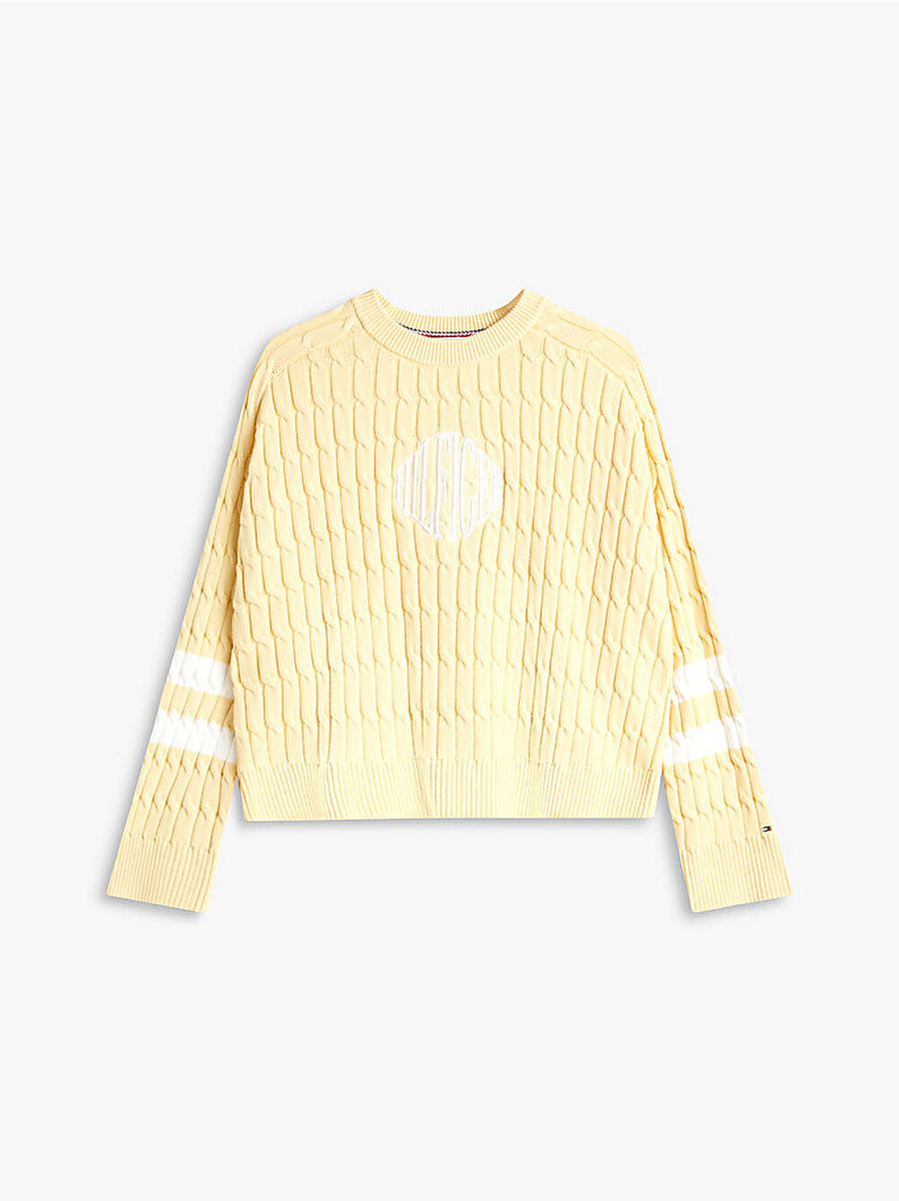 Bu saf pamuklu kablo örgü kazak, ön tarafta cesur yazı logolu nakışı ile imza bir son dokunuş sunuyor.