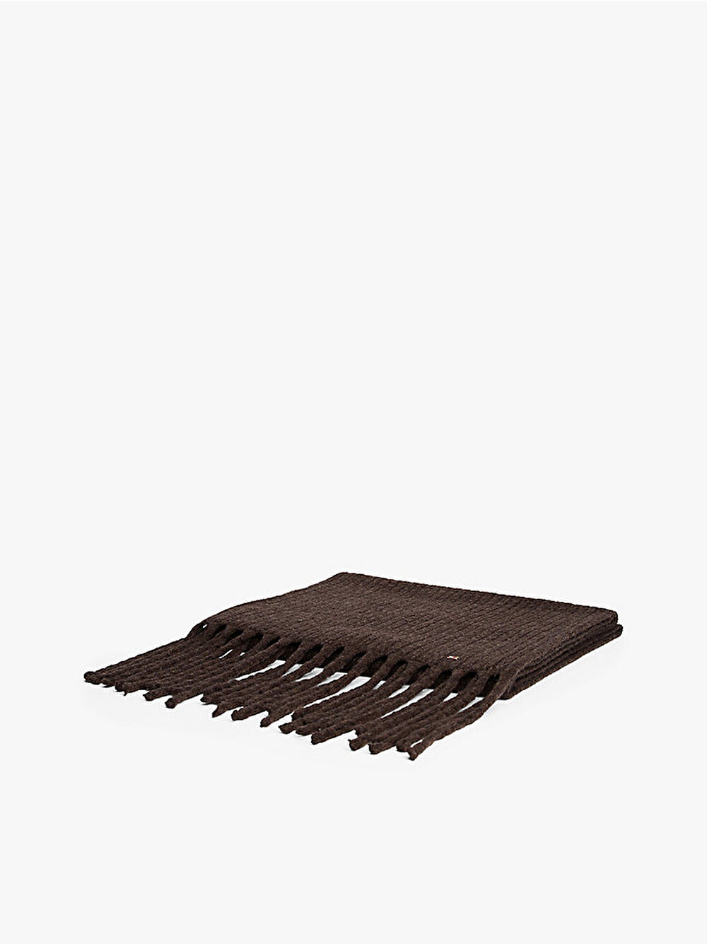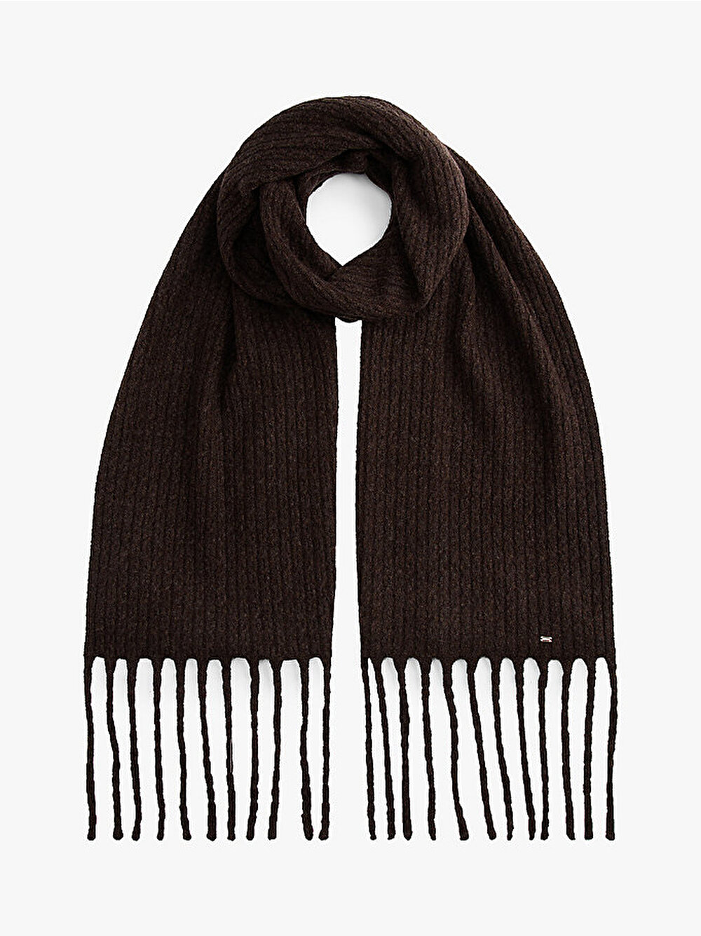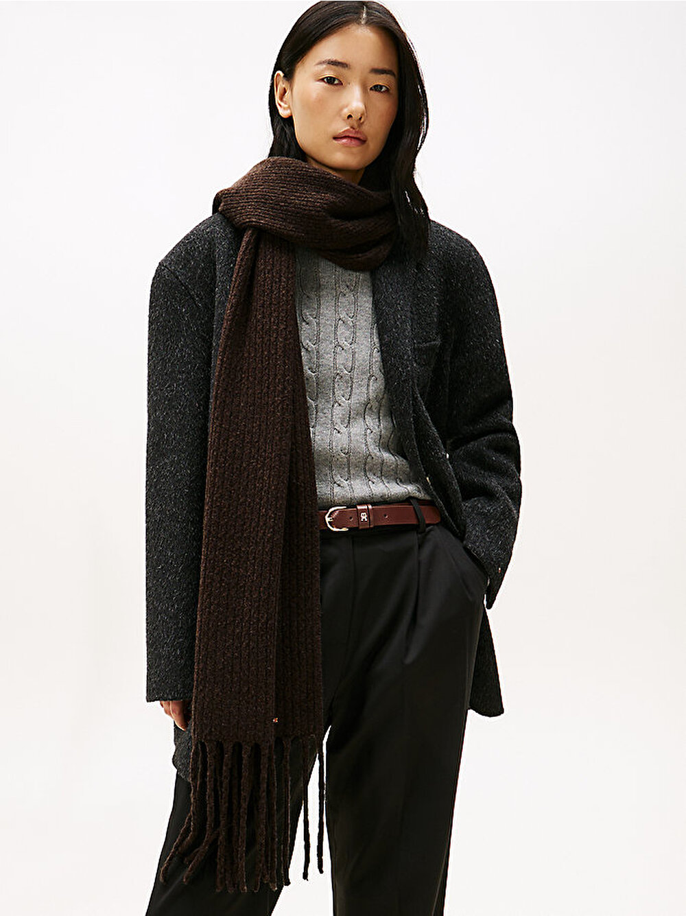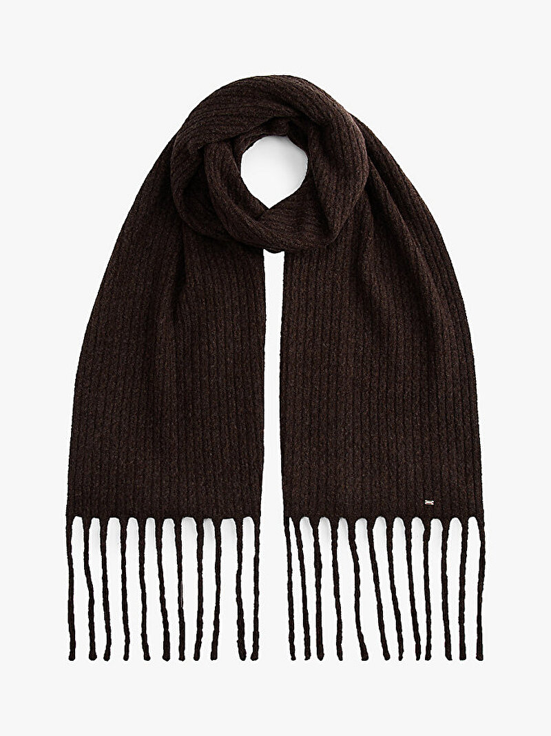 Dokulu püskül detayları ve lüks metal bayrak markalama ile tamamlanan bu kablo örgü atkı, serin günlerde sıcak tutar.