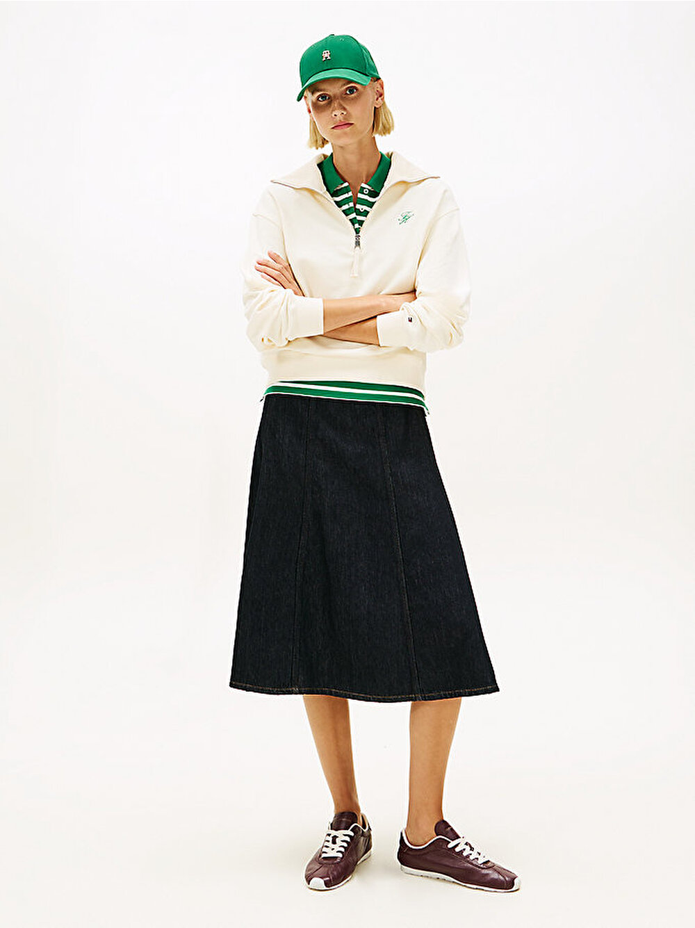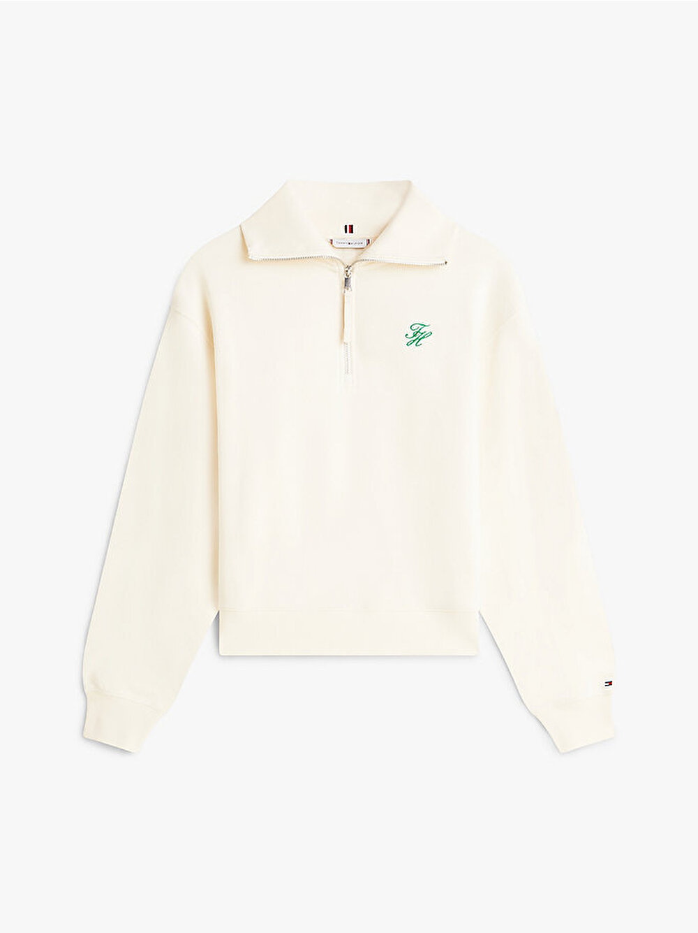 Abartılı yakalı yarım fermuarlı tasarım, yazı logosu nakışıyla süslenmiş bu klasik kazağa modern bir his katıyor.