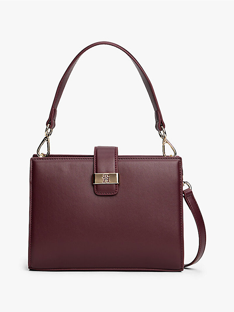 Bu kompakt satchel el çantası, TH monogram plakalı kapatma mekanizması ve yan tarafında asılı altın tonlu kabartmalı logo charm ile tamamlanıyor.