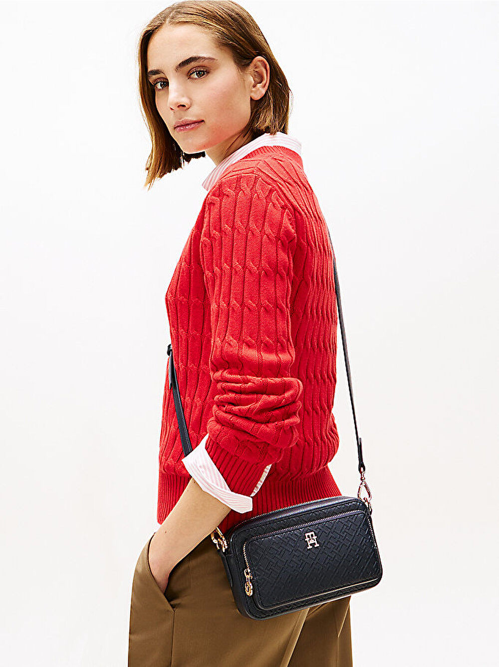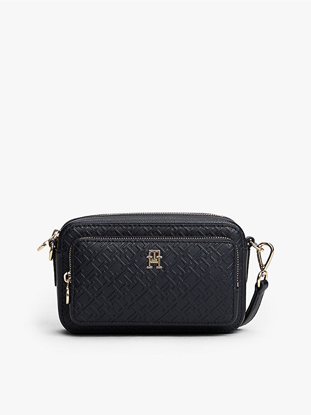 Kabartmalı TH monogram detayları ve parlak metal aksesuarlarıyla bu çapraz kamera çanta görünümünüze bir tutam lüks katar.