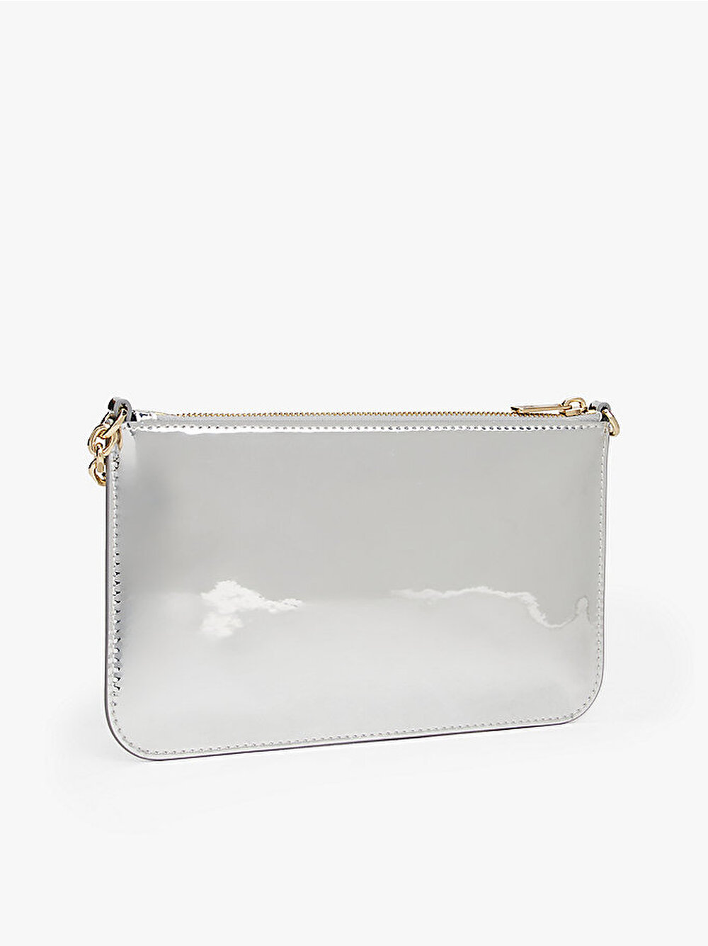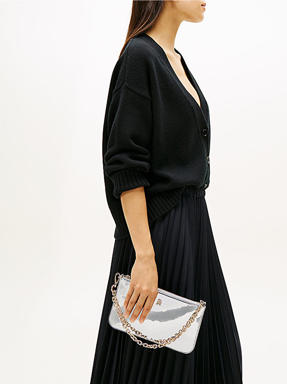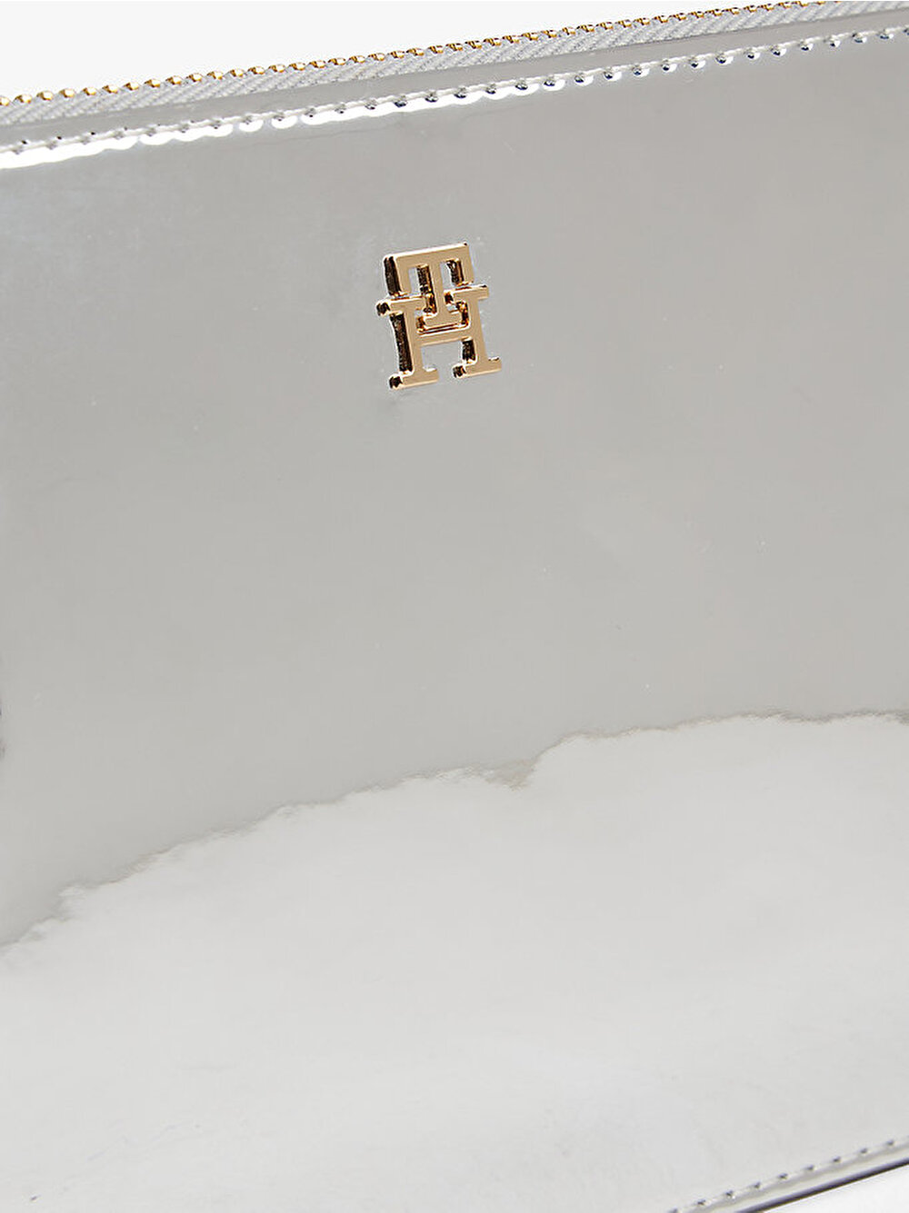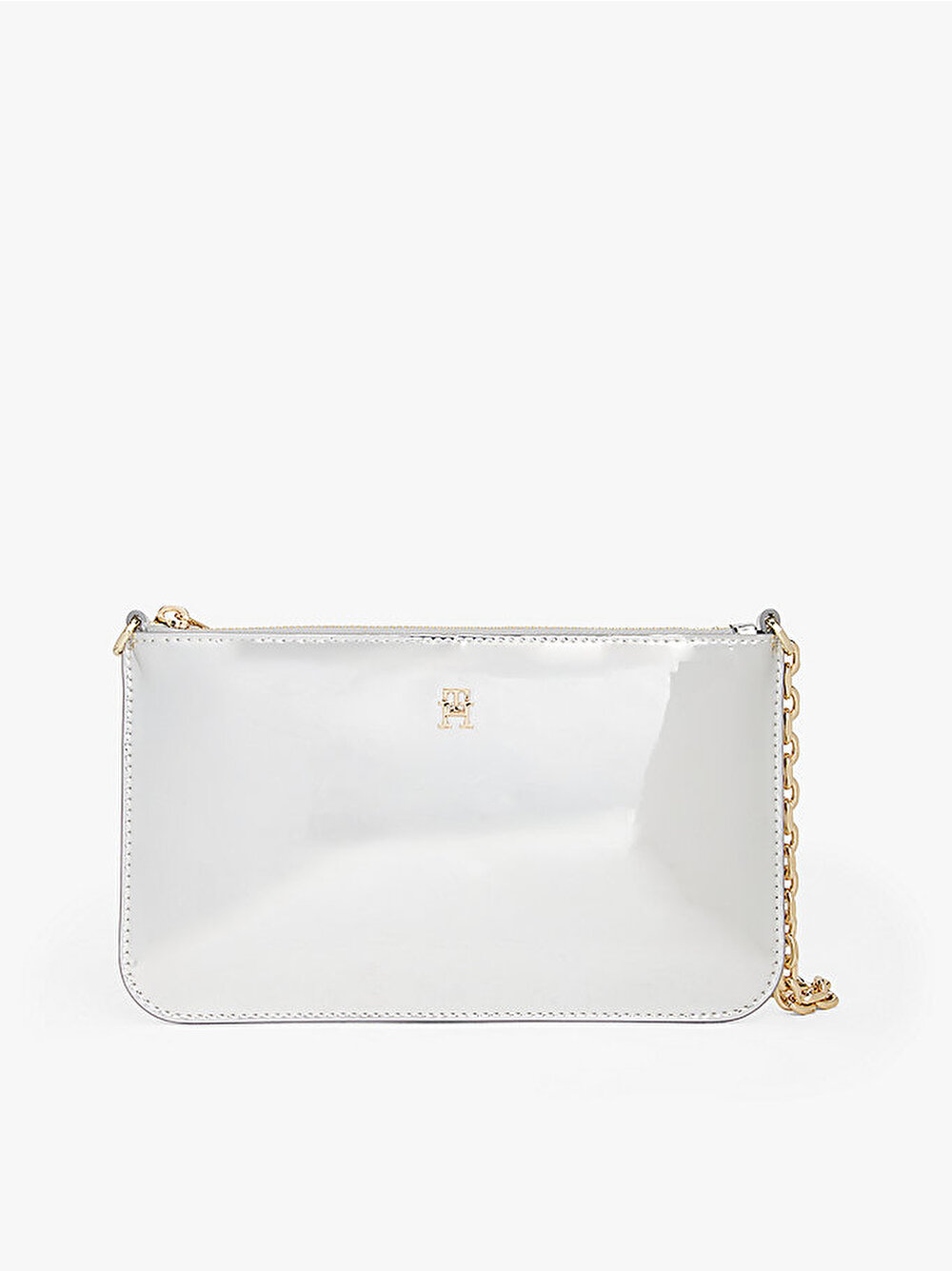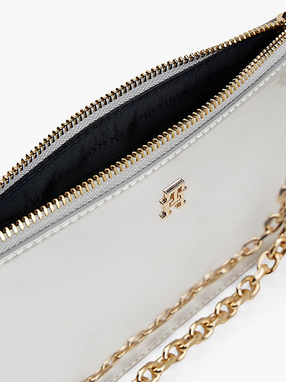 Şık zincir askısı ve uyumlu TH monogramı bulunan bu metalik omuz çantası ile gece kombinlerine karizmatik bir dokunuş katın.