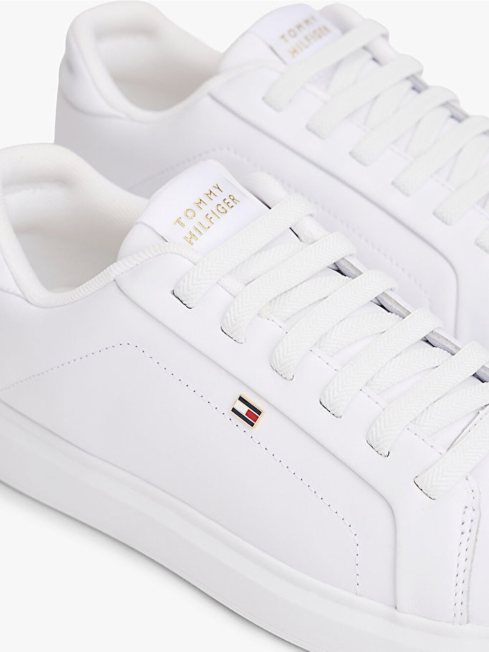 Klasik court siluetinde tasarlanan bu hafif deri trainers spor ayakkabı, canlı bir renk vurgusu için emaye bayrak detayıyla tamamlanmıştır.