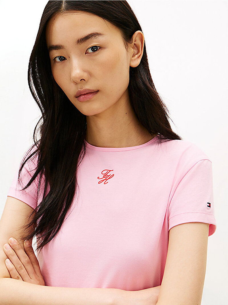 - Hafif esnek pamuklu jarseden üretilen bu slim-fit tişört, şık bir dokunuş sağlayan dokulu el yazısı logosuyla öne çıkıyor.