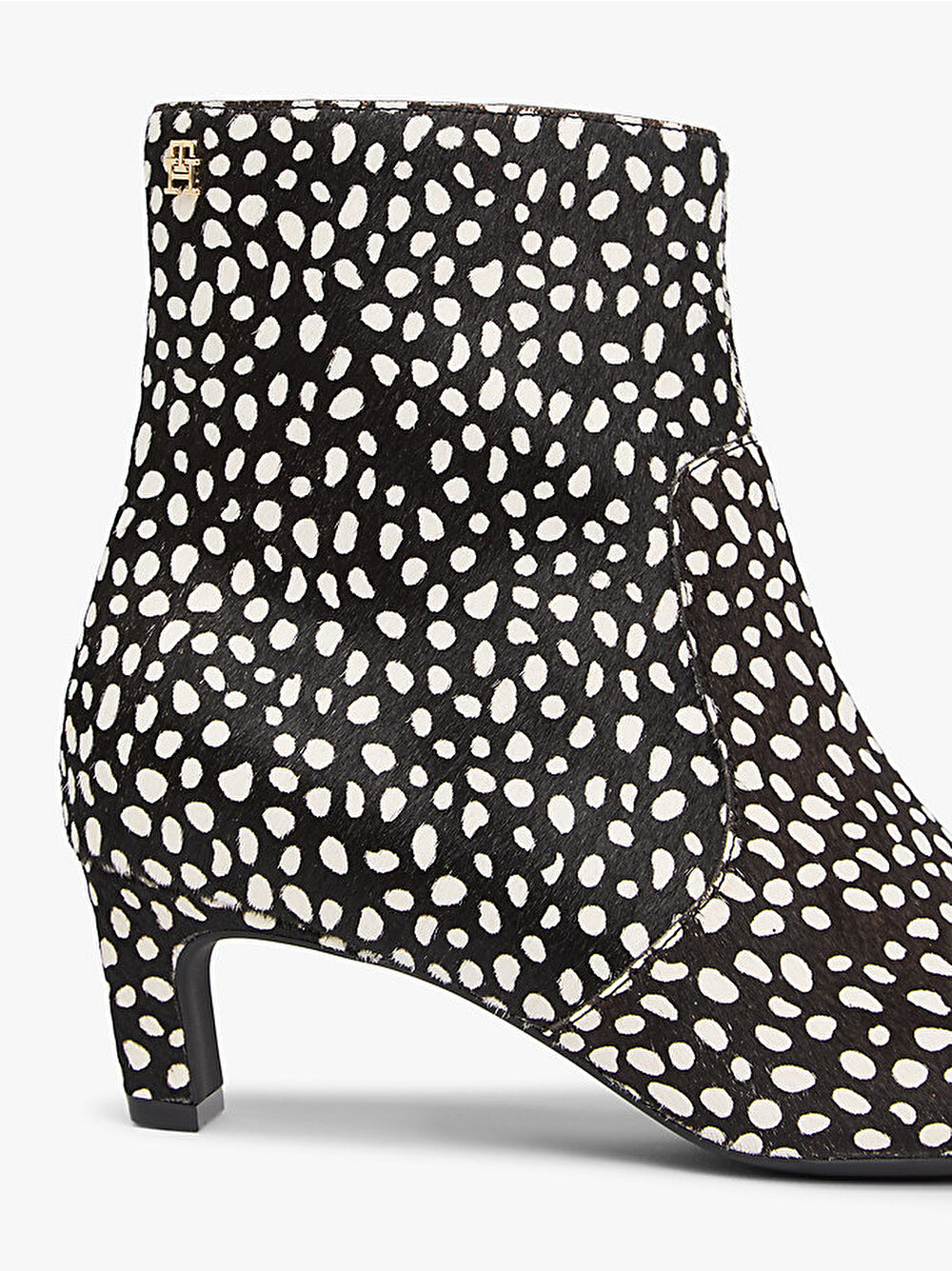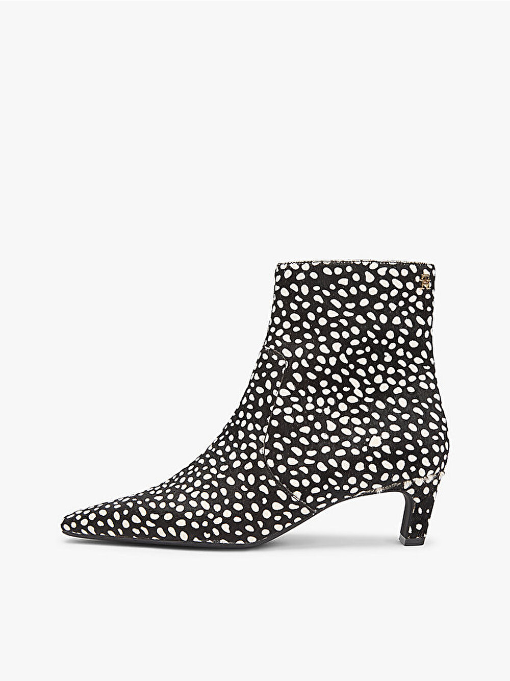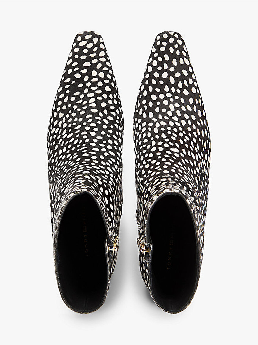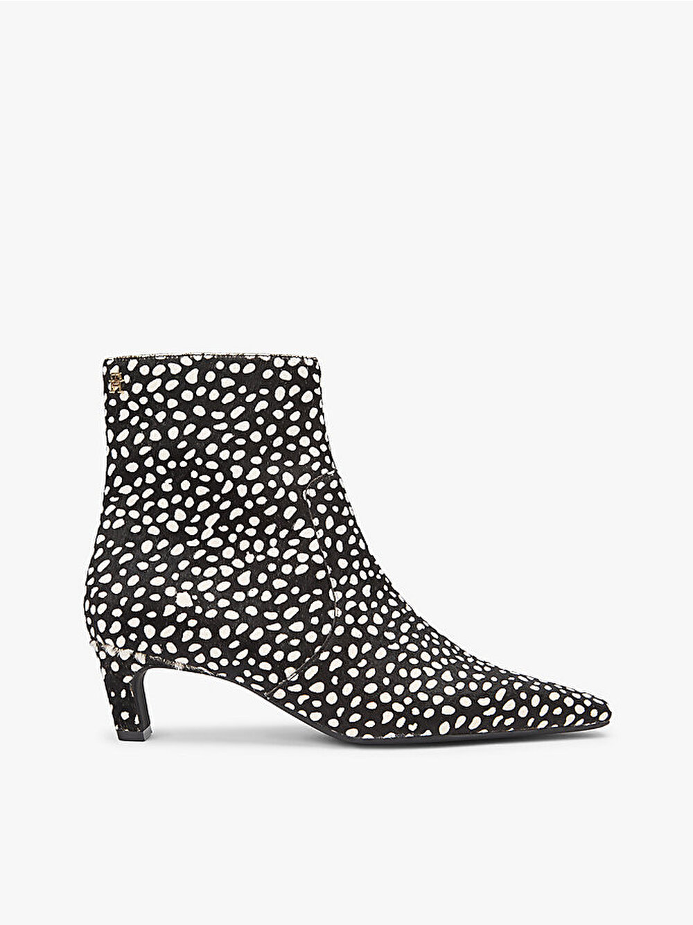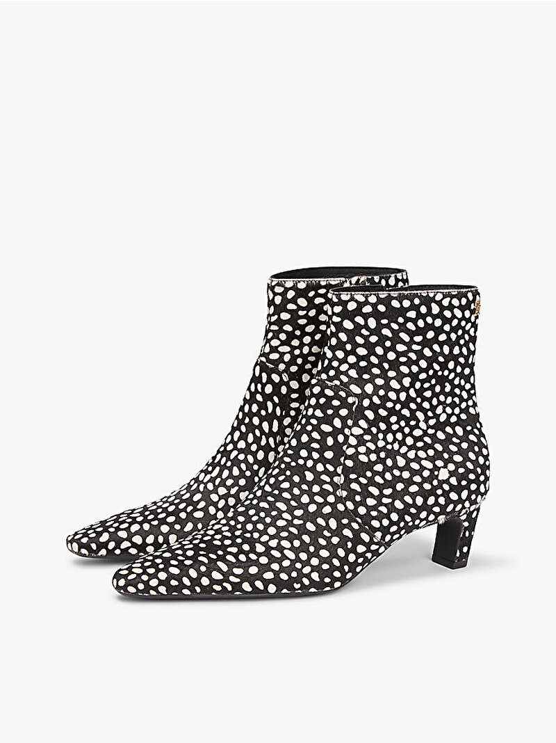 Dokulu inek tüyünden yapılan, şık sivri burunlu silueti ile dikkat çeken bu kar leoparı desenli bilek boy botlarla partiyi başlatın.