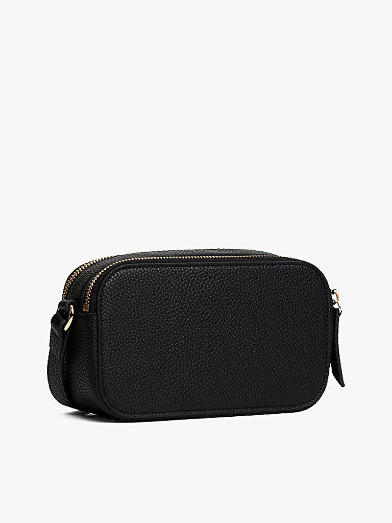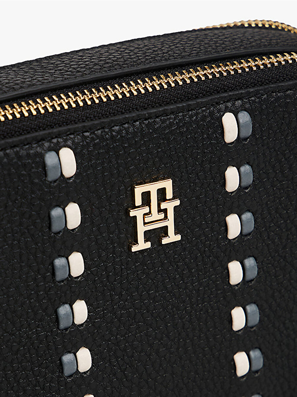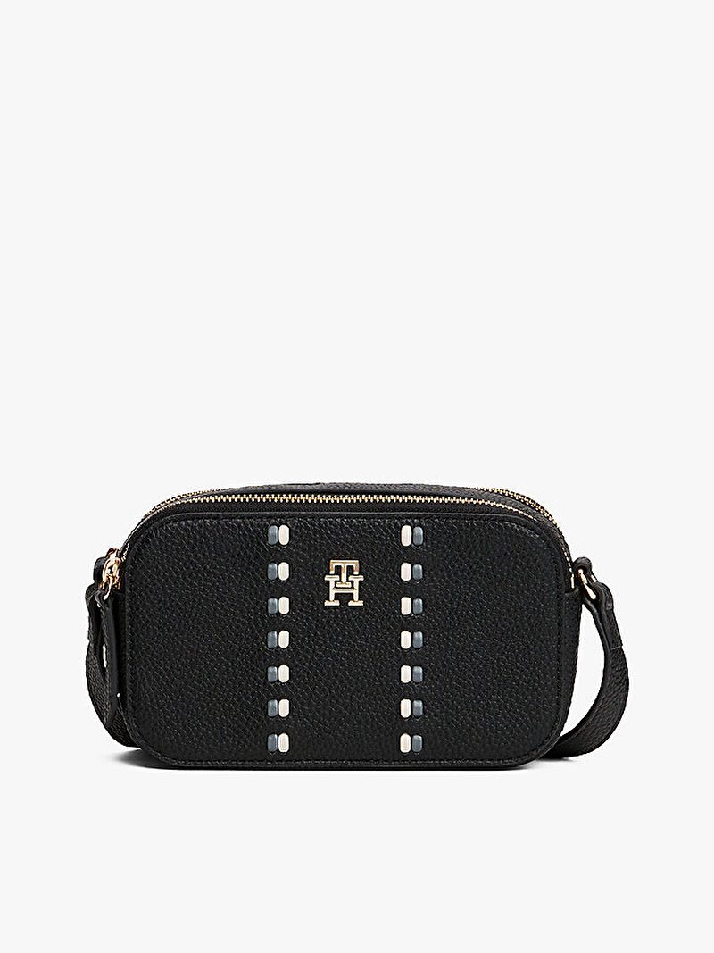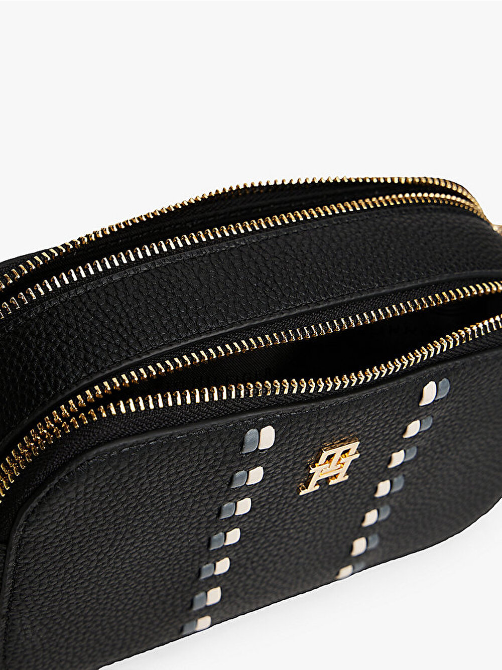 Klasik bir siluet, iki fermuarlı bölmeye, lüks parlak donanıma ve imza bant detayına sahip bu kamera çantada göz alıcı süslemelerle buluşuyor.