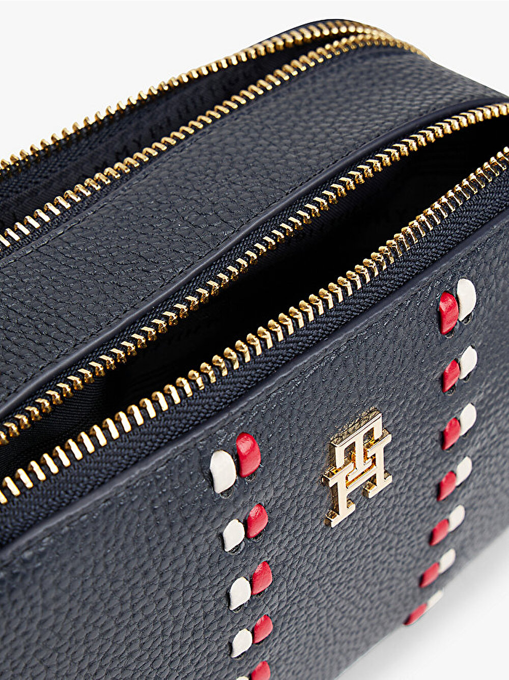 Klasik bir siluet, iki fermuarlı bölmeye, lüks parlak donanıma ve imza bant detayına sahip bu kamera çantada göz alıcı süslemelerle buluşuyor.
