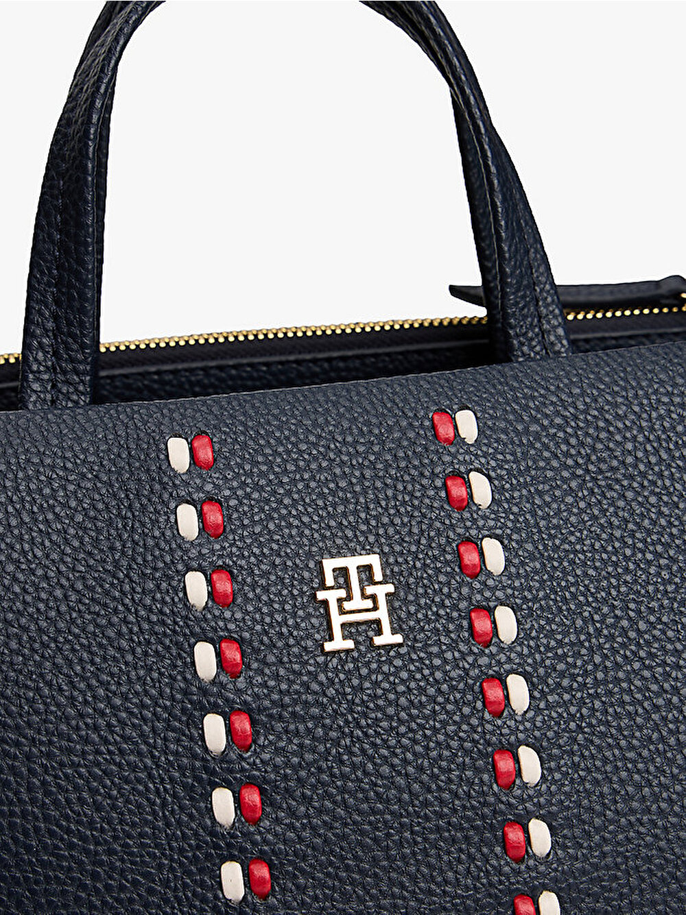 Bu çok yönlü satchel el çantası, çeşitli taşıma seçenekleri sunarken, imza bant detayları göz alıcı bir görünüm katıyor.
