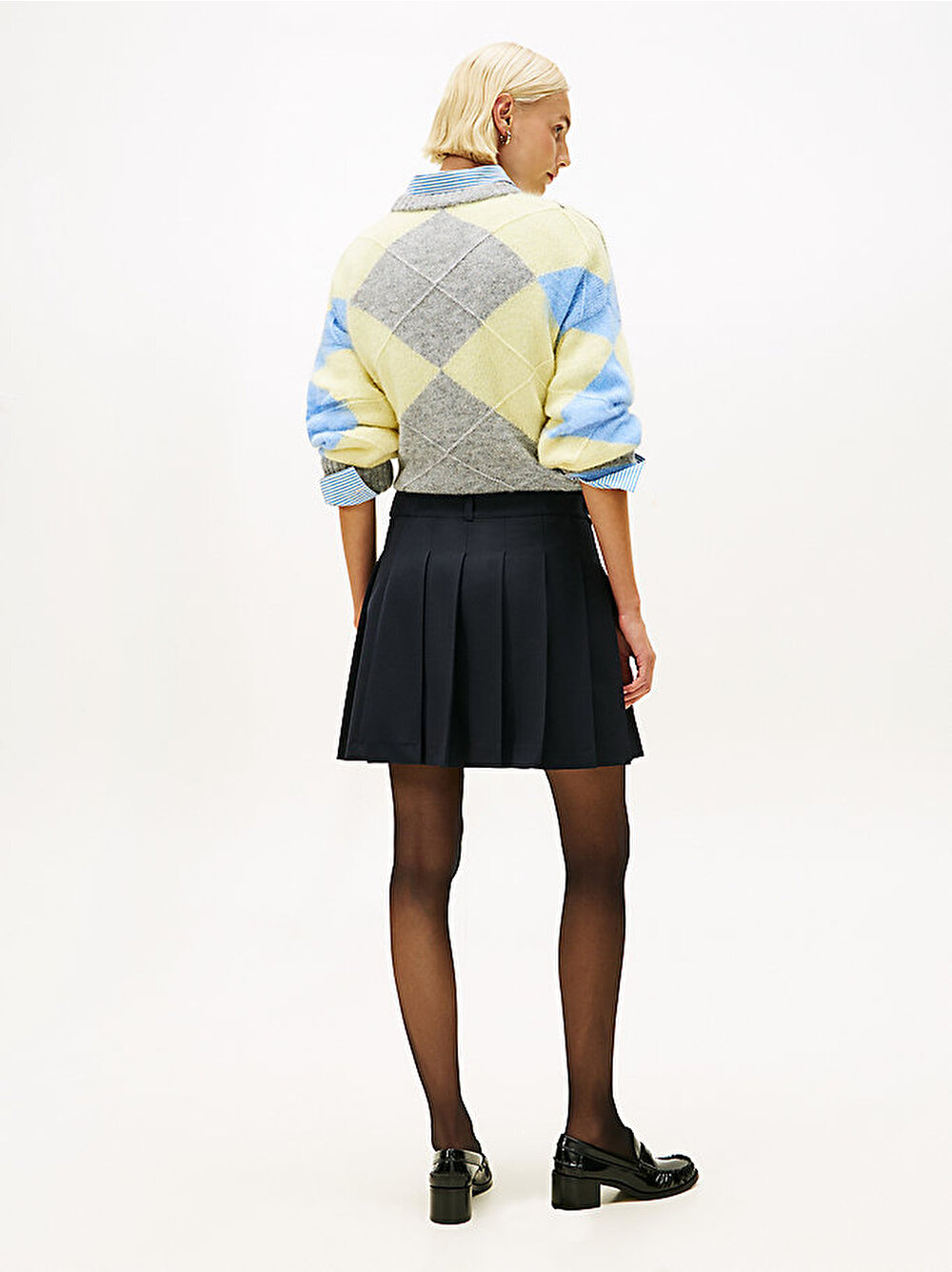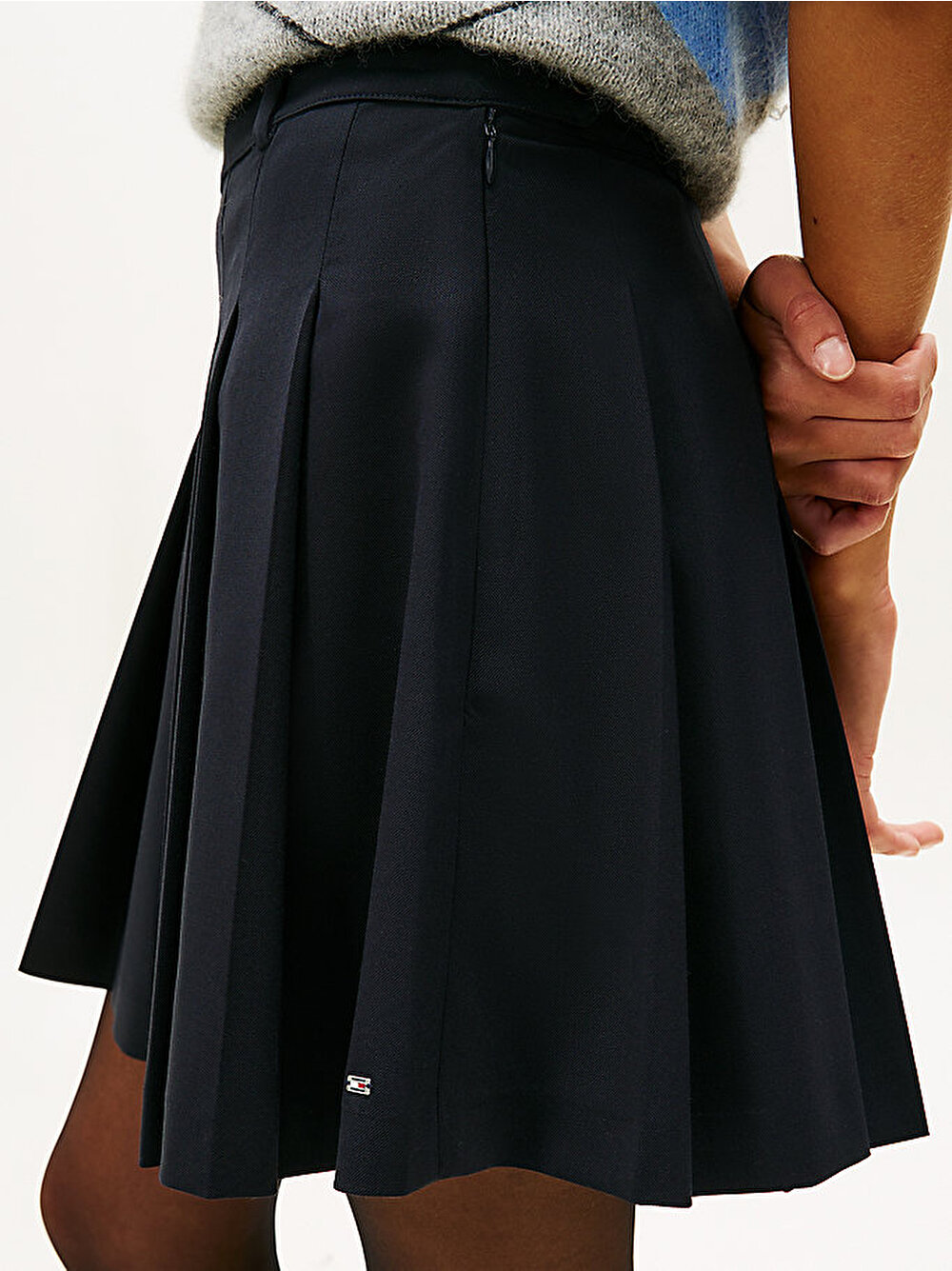 Esnek yün karışımından üretilmiş ve marka detaylarıyla tamamlanmış bu pileli mini etekle gündüzden geceye zahmetsizce geçiş yapın.