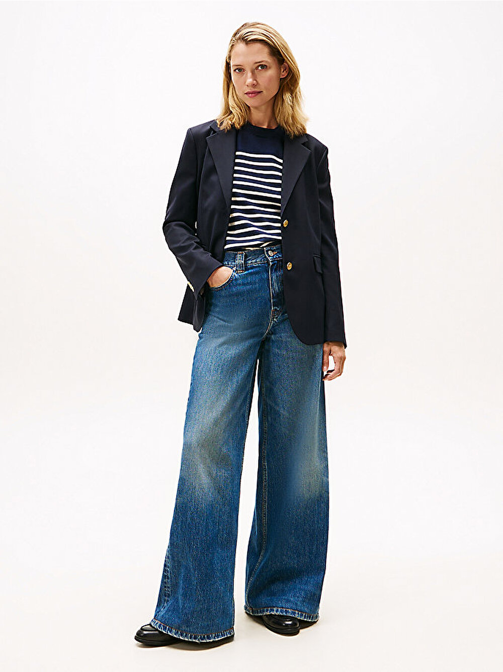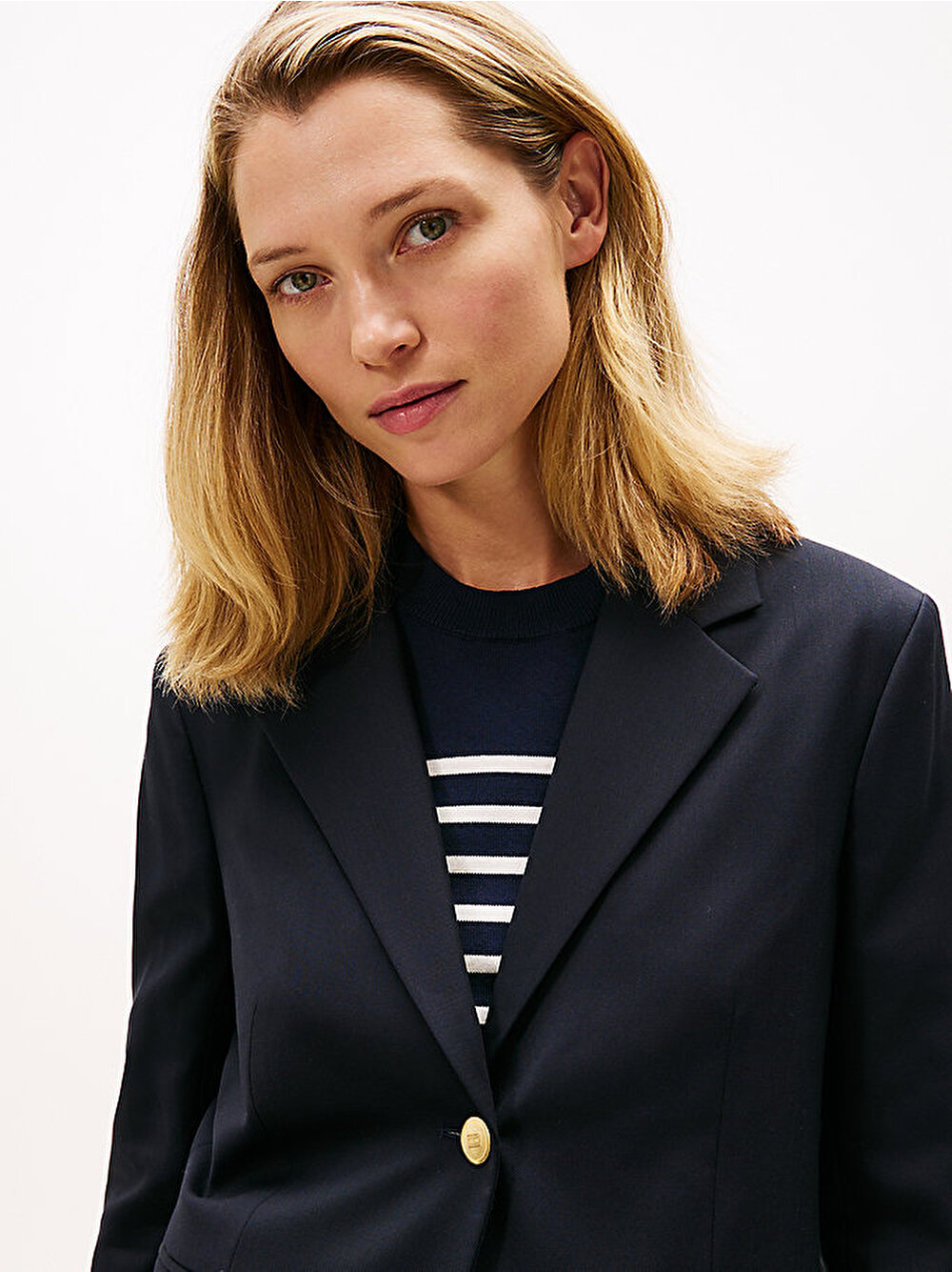 Esnek yün karışımından üretilmiş bu tek düğmeli blazer, kusursuz bir kesim sunar ve markalı altın tonlu düğmelerle tamamlanır.