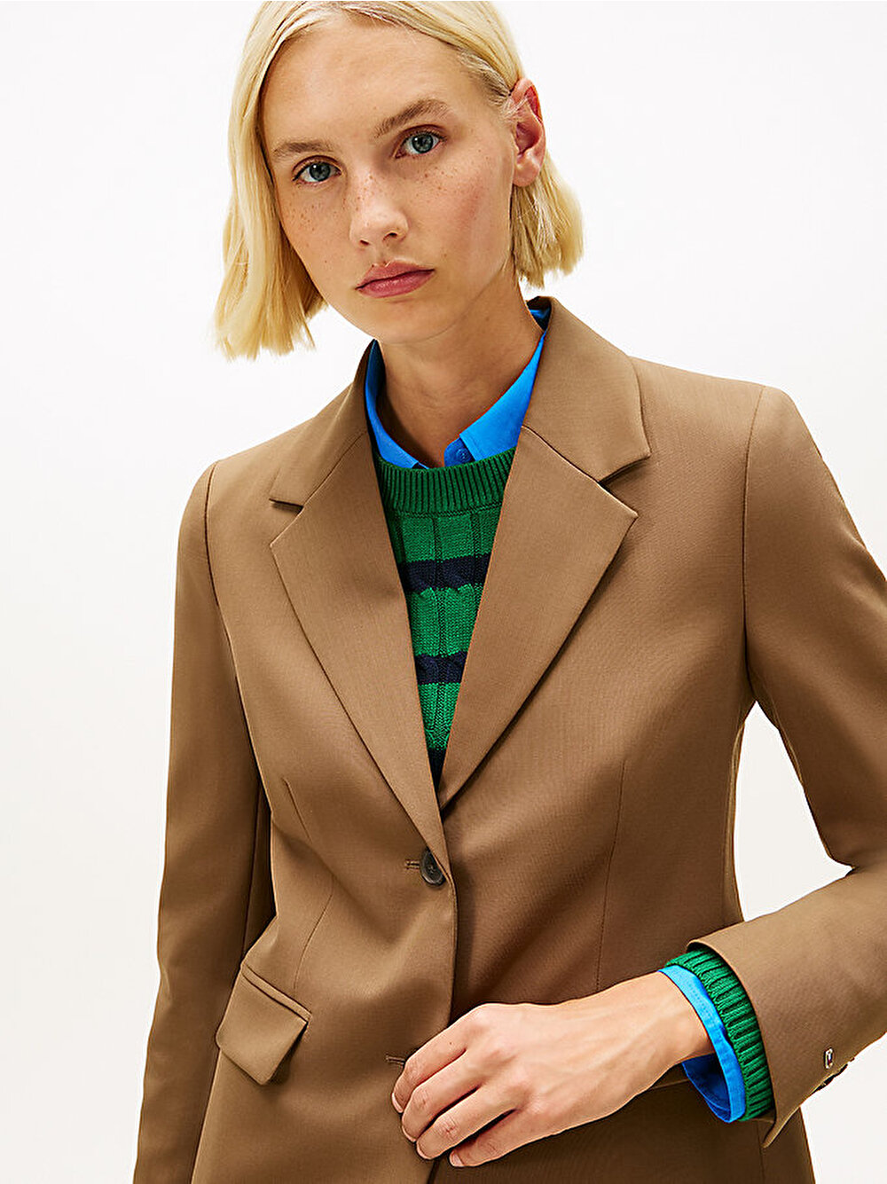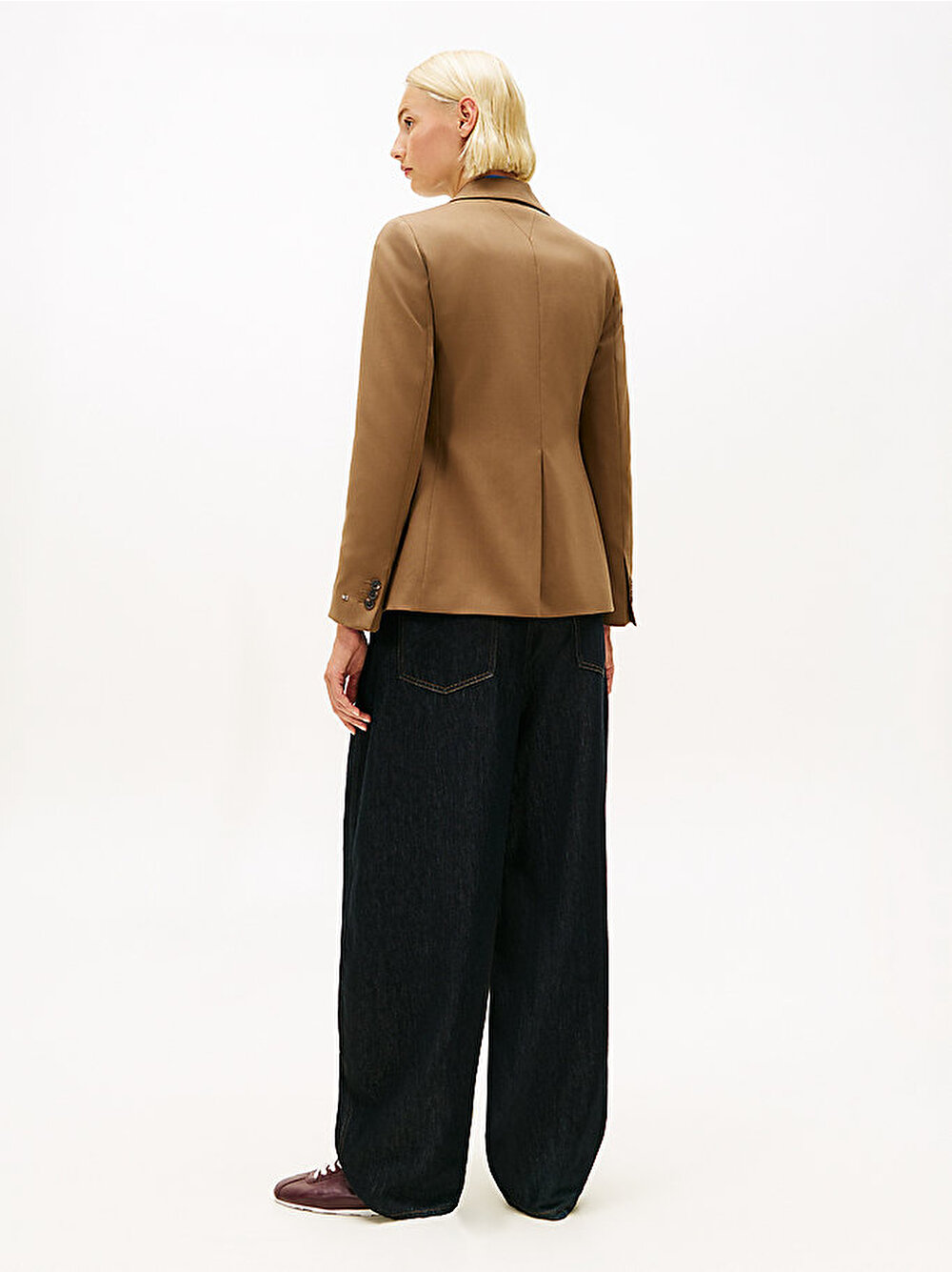 Hafif esnek premium yün karışımı kumaştan üretilen bu tek düğmeli blazer, şık kombinlere zarif bir son dokunuş kazandırır.