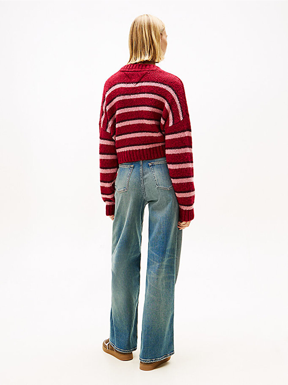 Klasik V yaka kesimi ve baştan aşağı rengarenk çizgilerle örülen bu hırka, katmanlı stillere dokunsal bir hava katıyor.