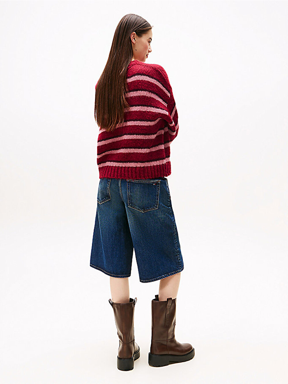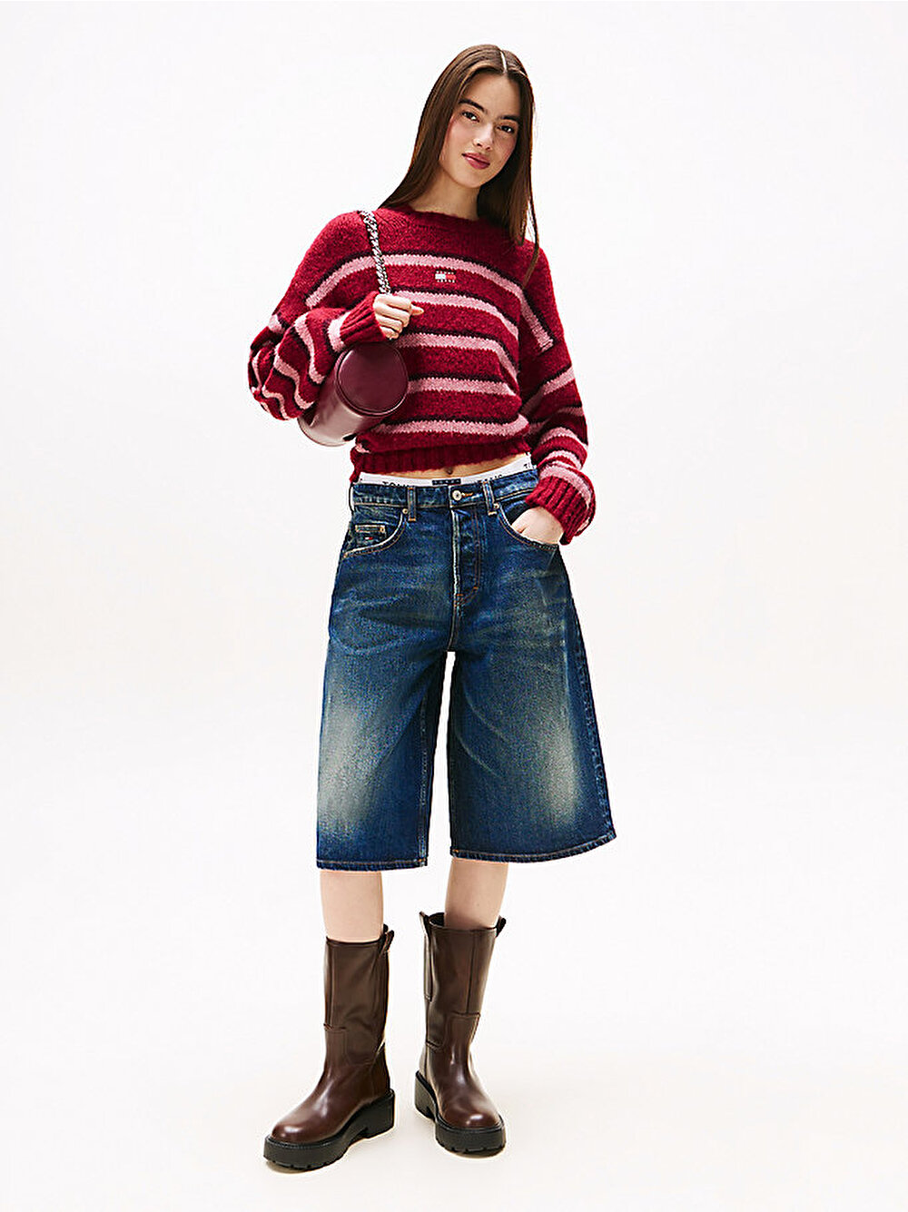 Cesur bir yatay çizgi deseniyle süslenmiş bu rahat kesim kazak ile triko koleksiyonunuza biraz retro enerji katın.
