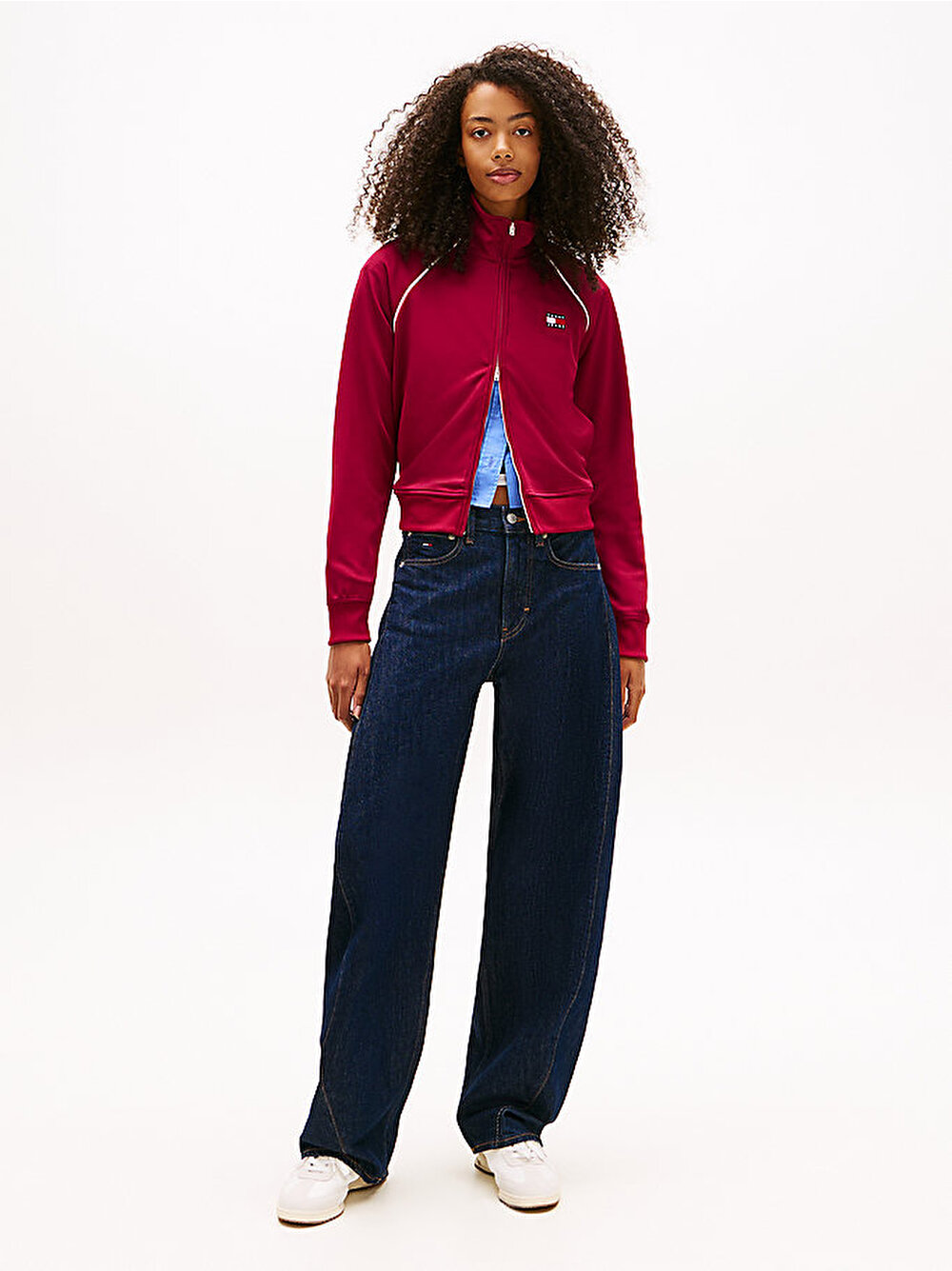 Esnek teknik kumaştan üretilen bu çarpıcı eşofman ceket, kontrast biyeli fermuarlı dik yakasıyla retro esintili sportif bir stil oluşturuyor.