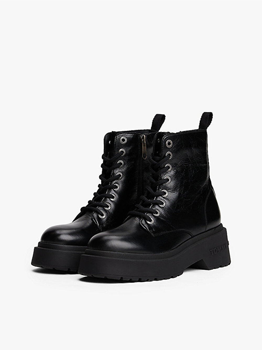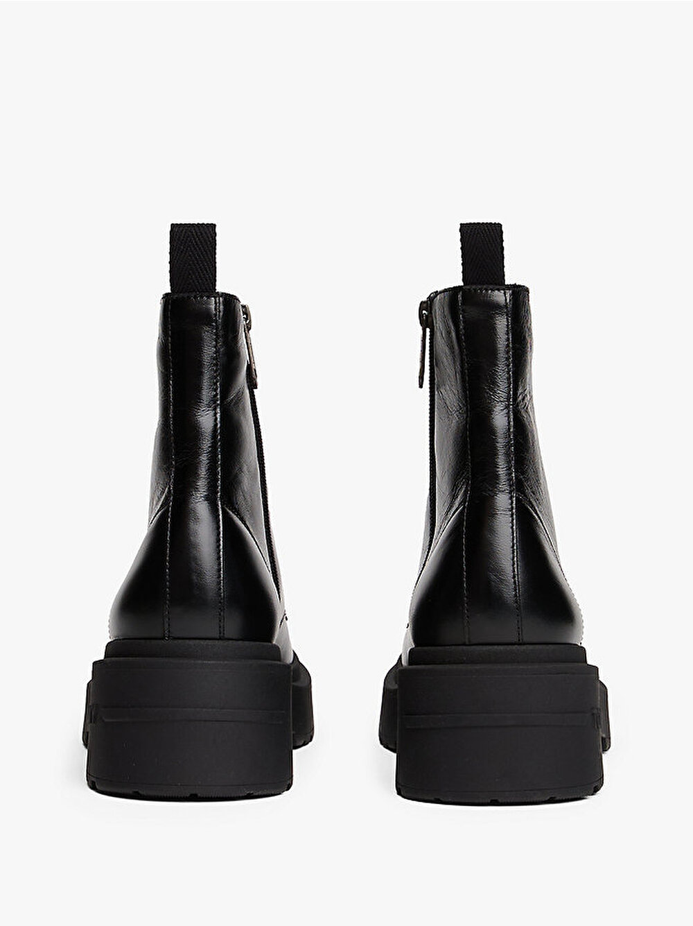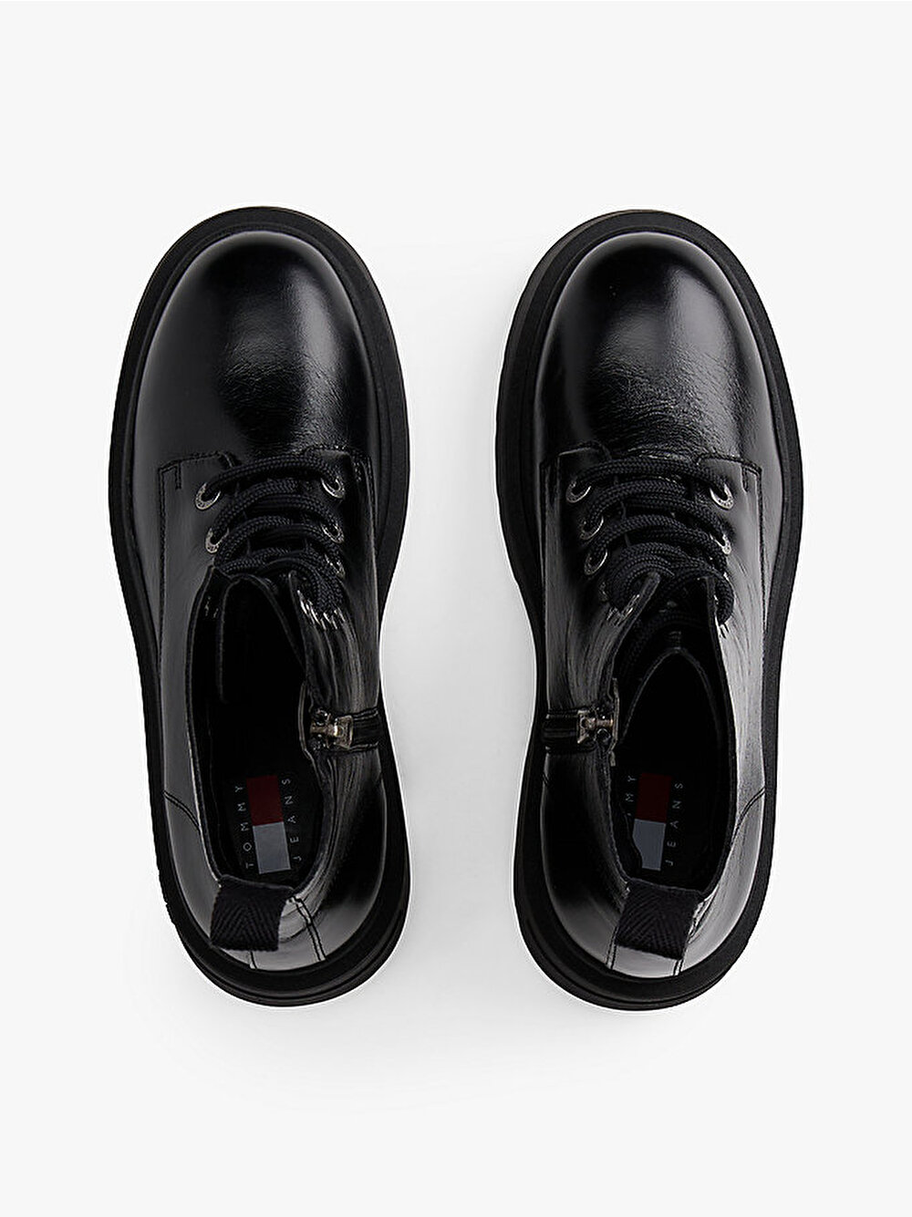 Bu kalın orta boy botlar, göz alıcı bir görünüm için parlak deriden üretilmiştir ve kalın tırtıklı tabanlarla tamamlanmıştır.