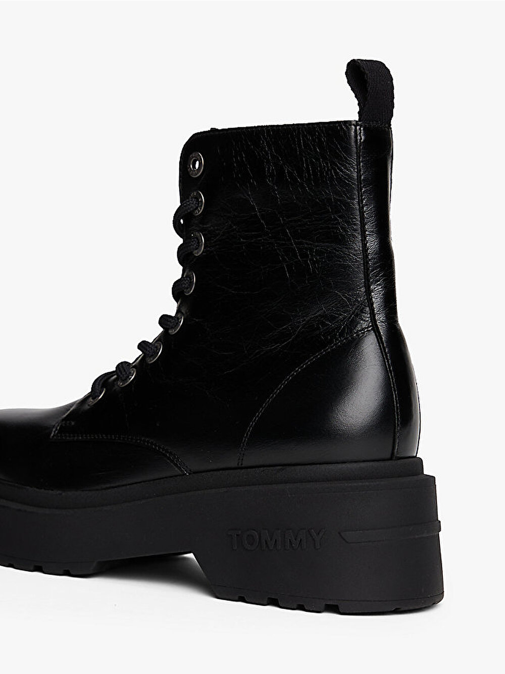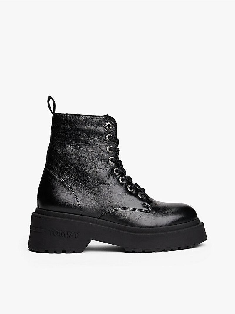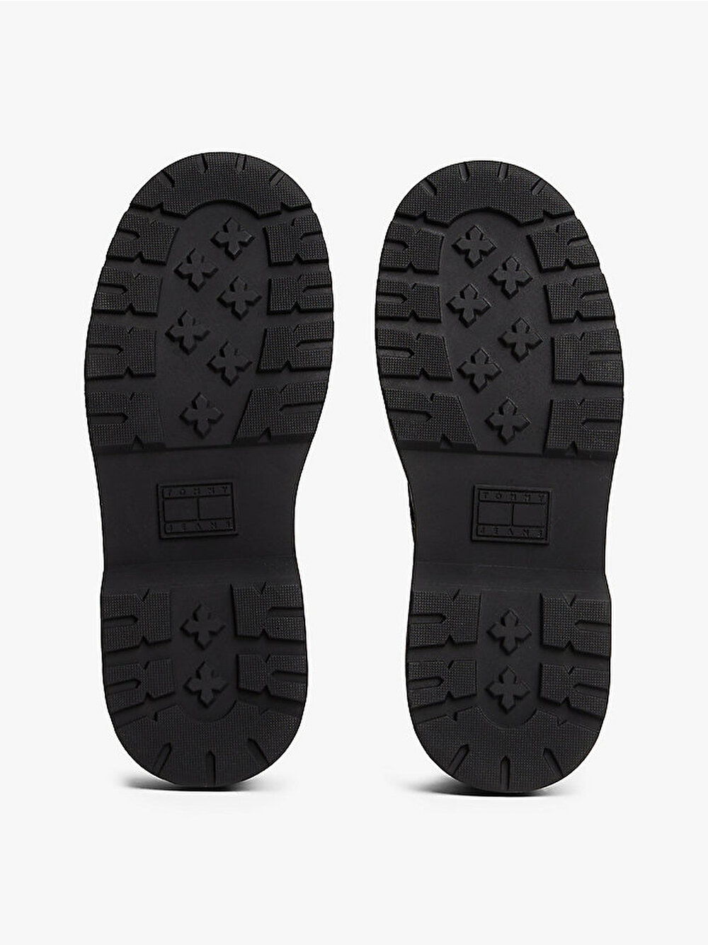 Bu kalın orta boy botlar, göz alıcı bir görünüm için parlak deriden üretilmiştir ve kalın tırtıklı tabanlarla tamamlanmıştır.