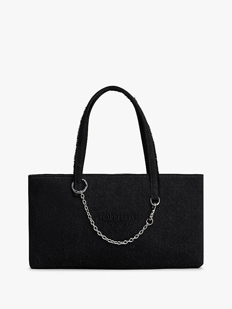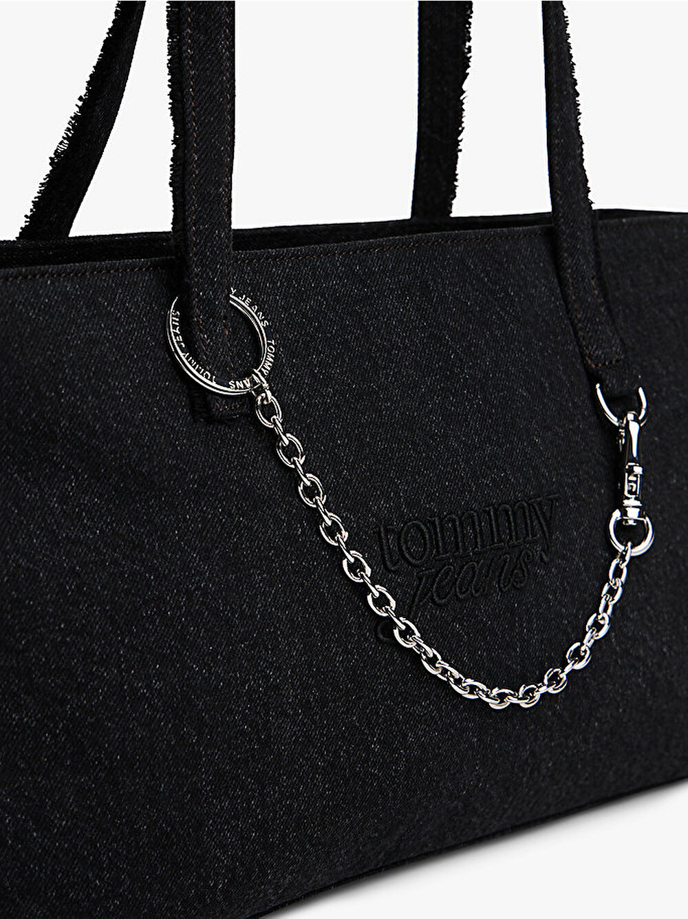 Zincir detayları ve logo nakışlarıyla tamamlanan bu denim tote çanta ile sokak giyim tarzınızı bir üst seviyeye taşıyın.