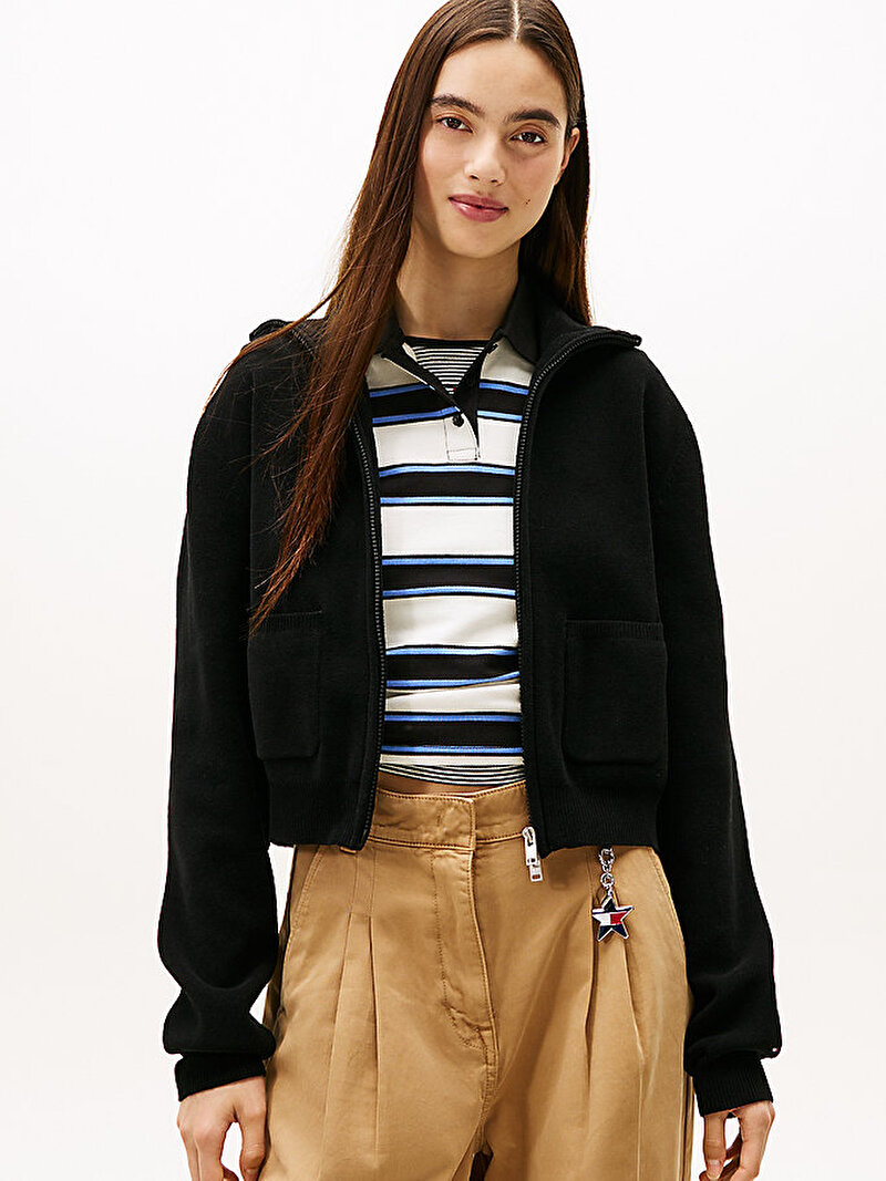 Rahat bir siluete sahip ve lüks çapraz dikişli logoyla süslenmiş bu modern fermuarlı hırka ile triko seçeneklerinizi güncelleyin.