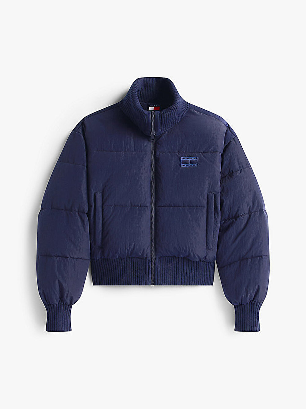 Havalı kısa boyuyla rahat bir siluete sahip olan bu kadife şişme mont ile her güne üniversite havası katın.