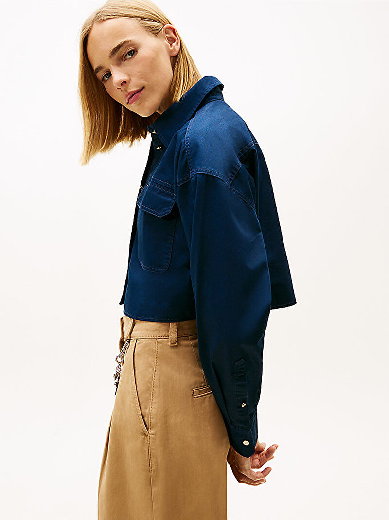 Geniş oversize kesimiyle dikkat çeken bu crop gömlek, göğüs cepleri ve logolu metal düğmeleriyle işlevsel bir tarz sunuyor.